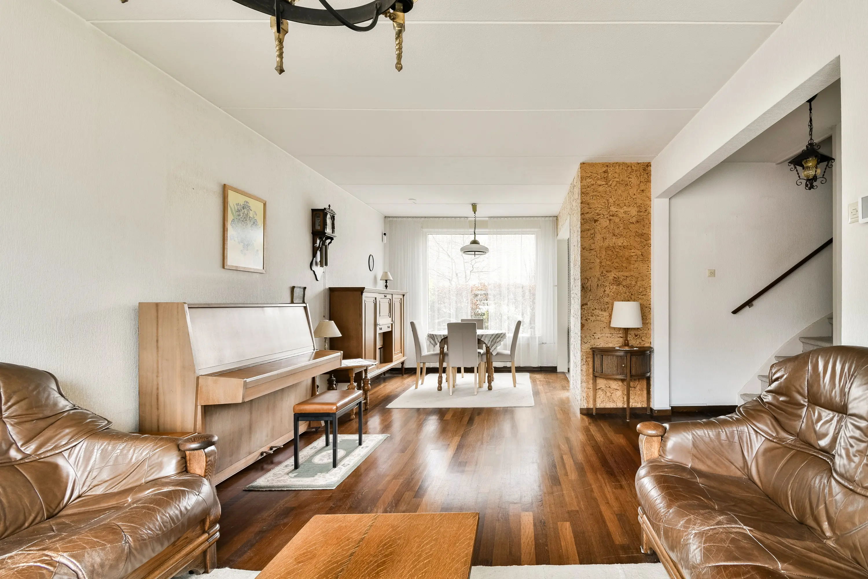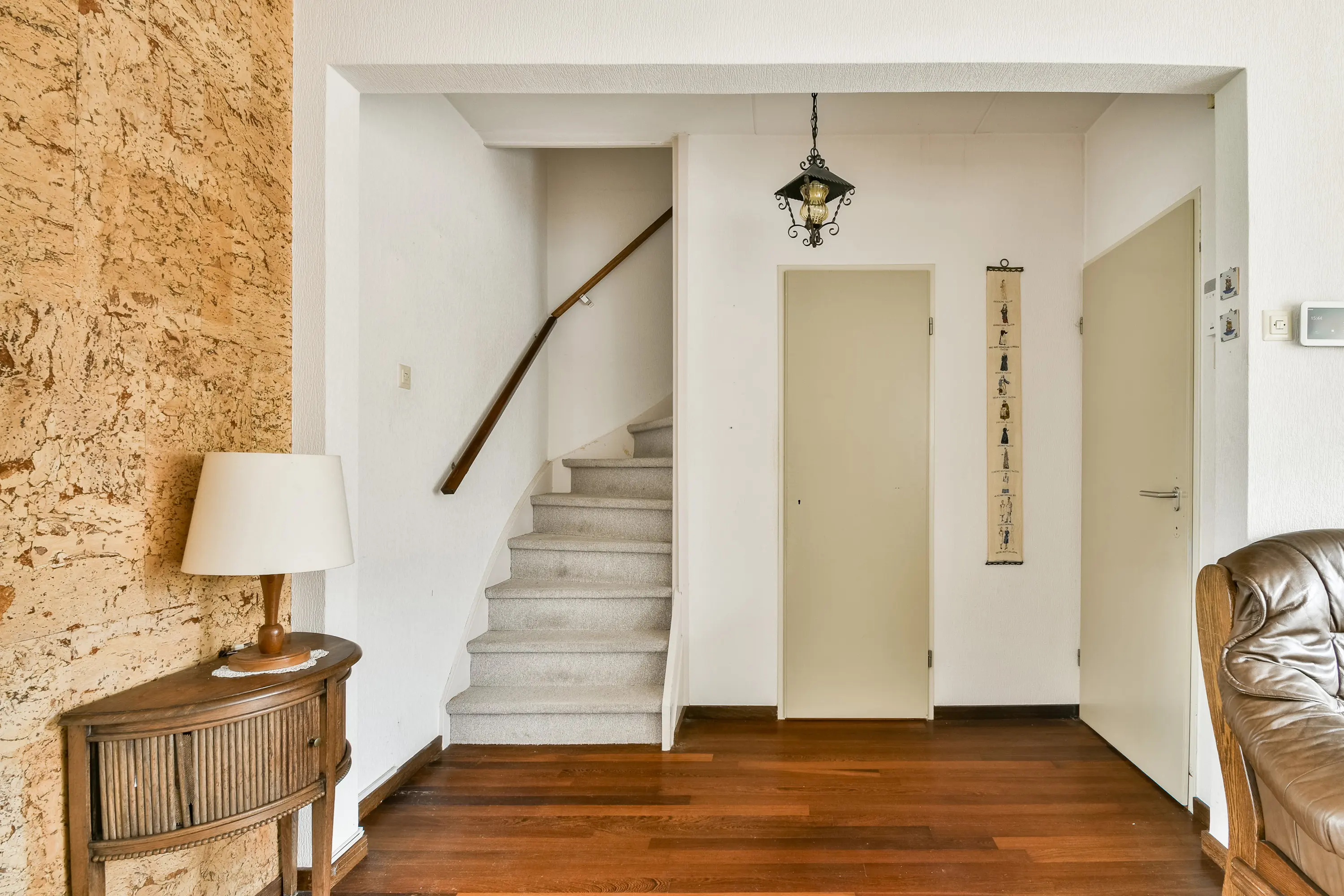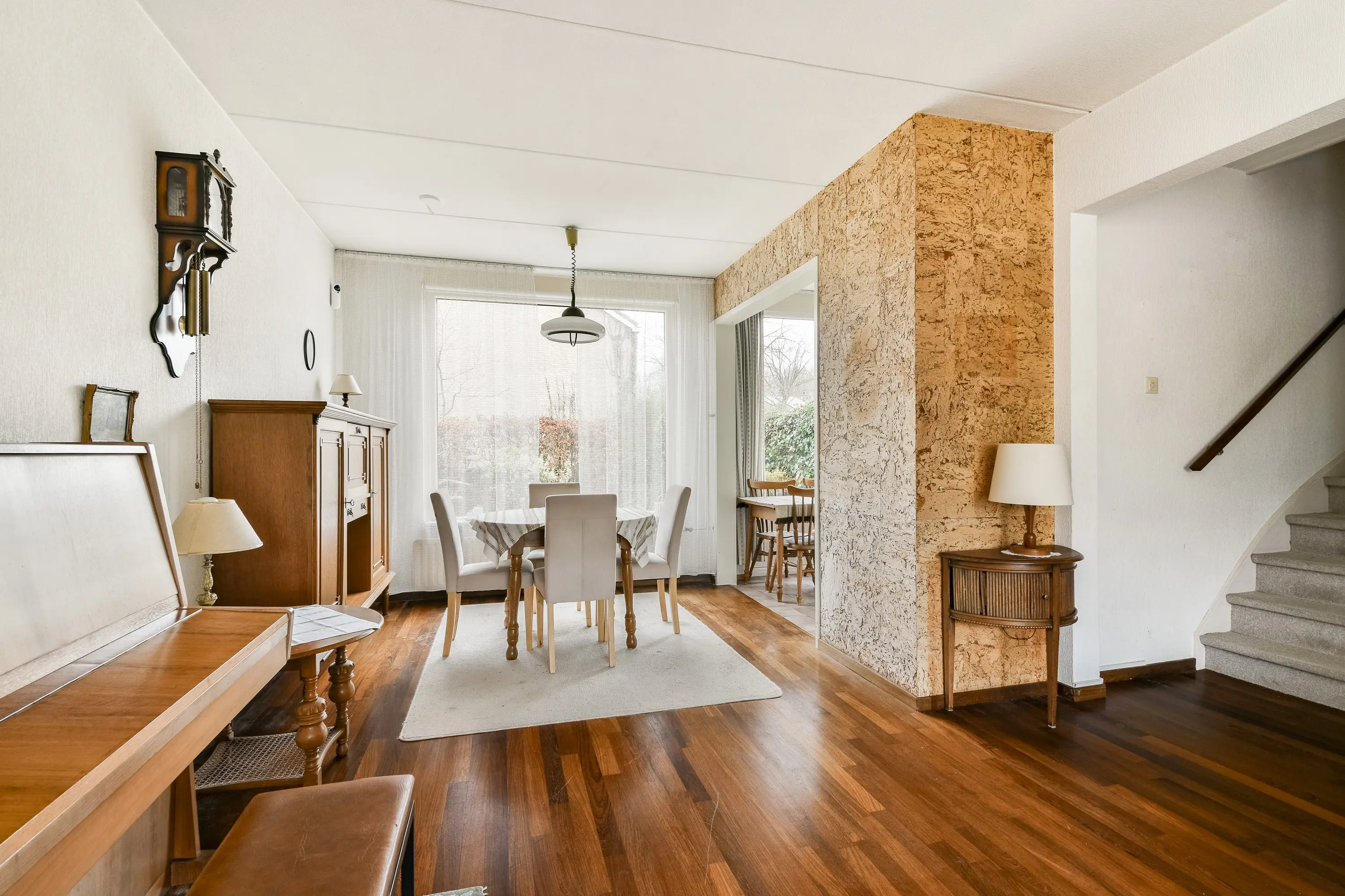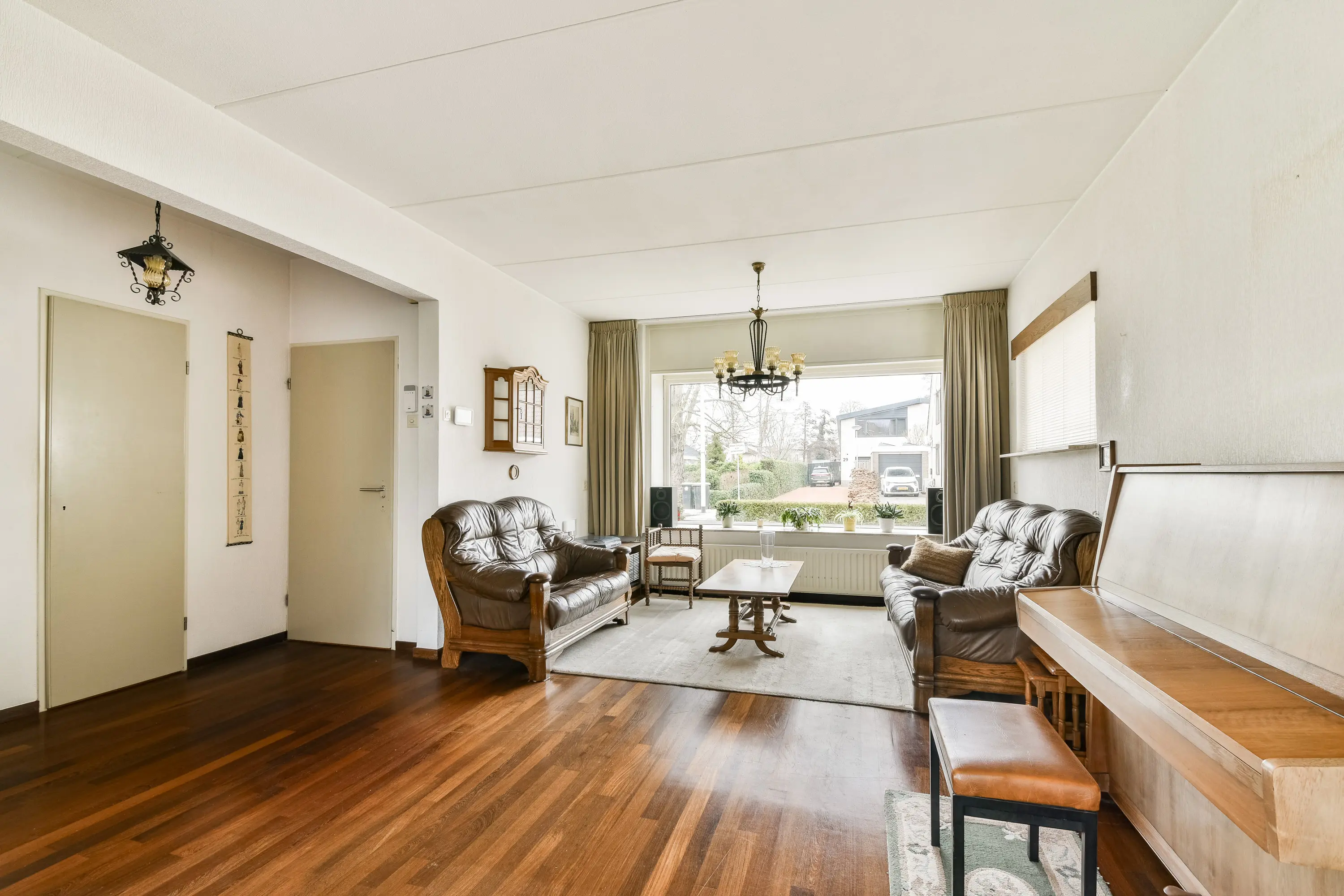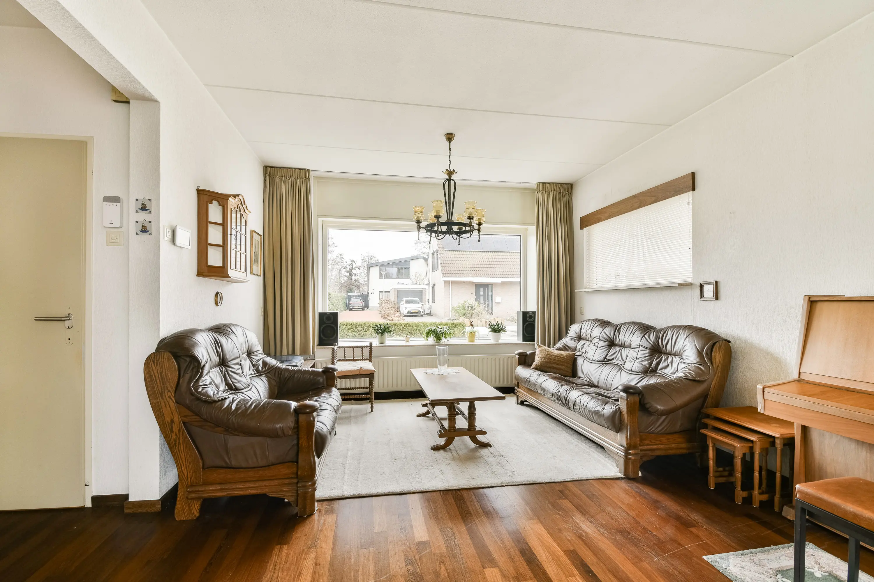De woonkamer is heerlijk licht dankzij de grote raampartij aan de voorzijde en beschikt over een warme parketvloer. De praktische trapkast biedt extra bergruimte.
