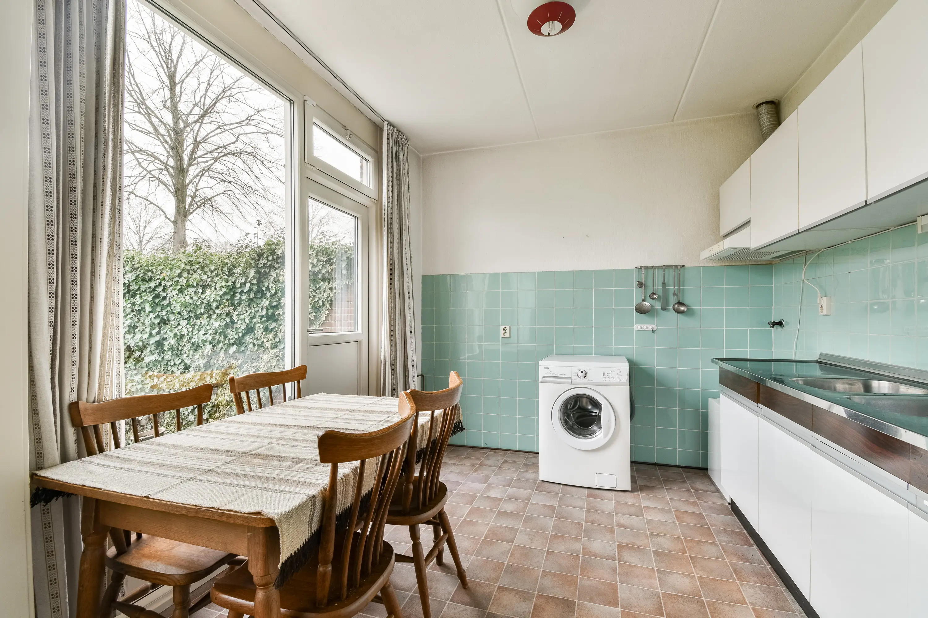 Aan de achterzijde bevindt zich de keuken met zicht op de tuin.