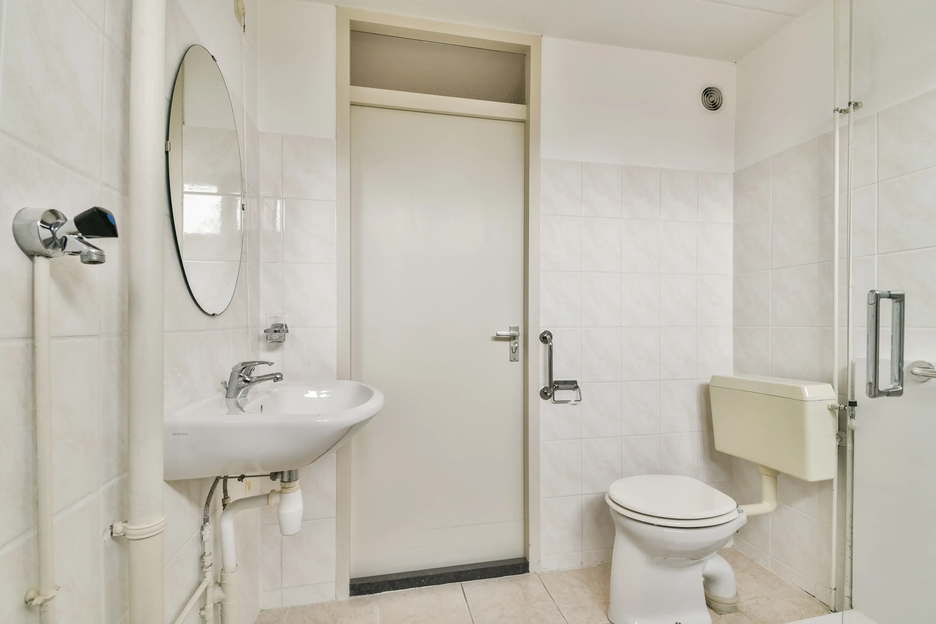 De badkamer is voorzien van een inloopdouche, wastafel, toilet en een raam voor natuurlijke ventilatie. Tevens is hier een opstelplaats voor de wasmachine gerealiseerd.