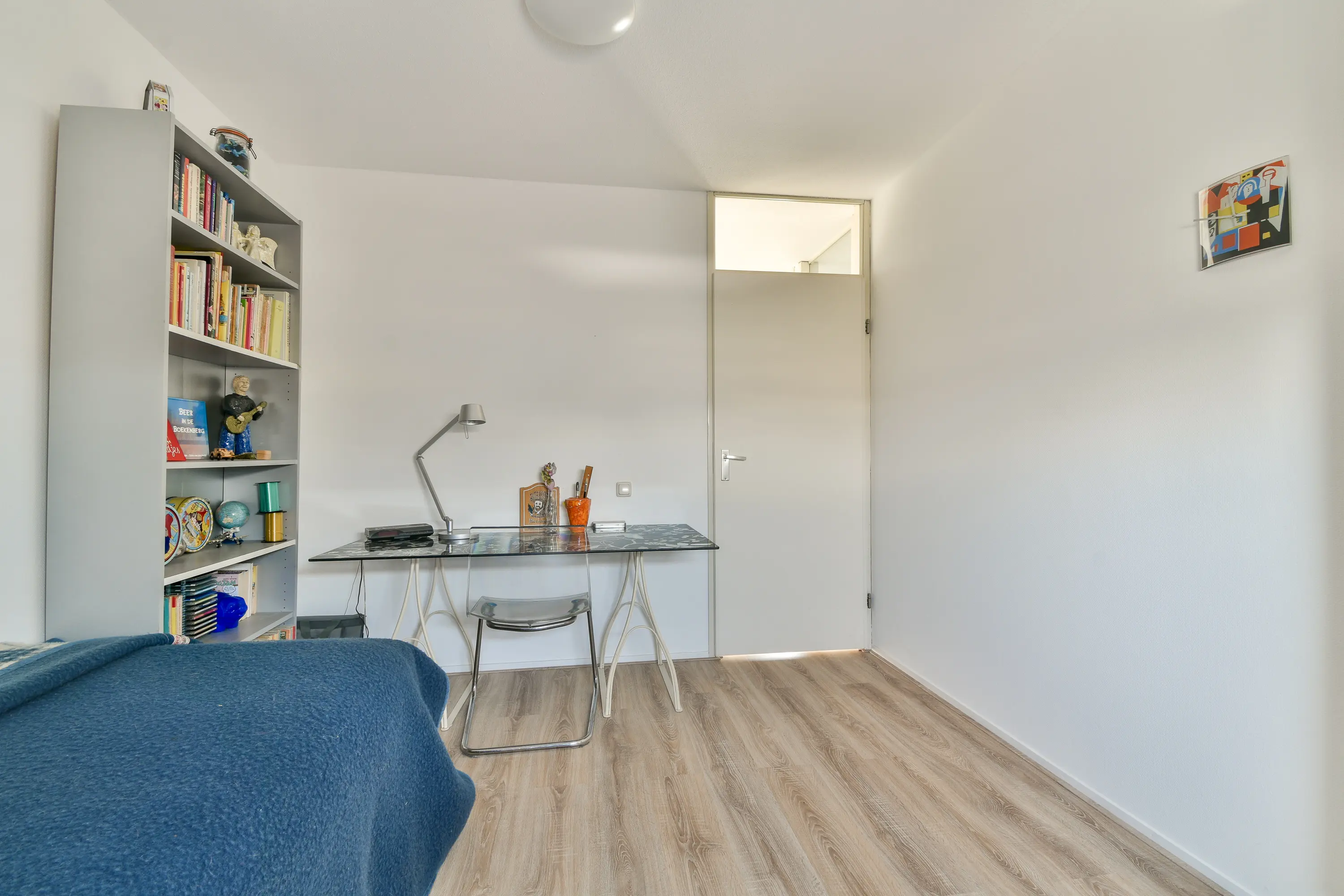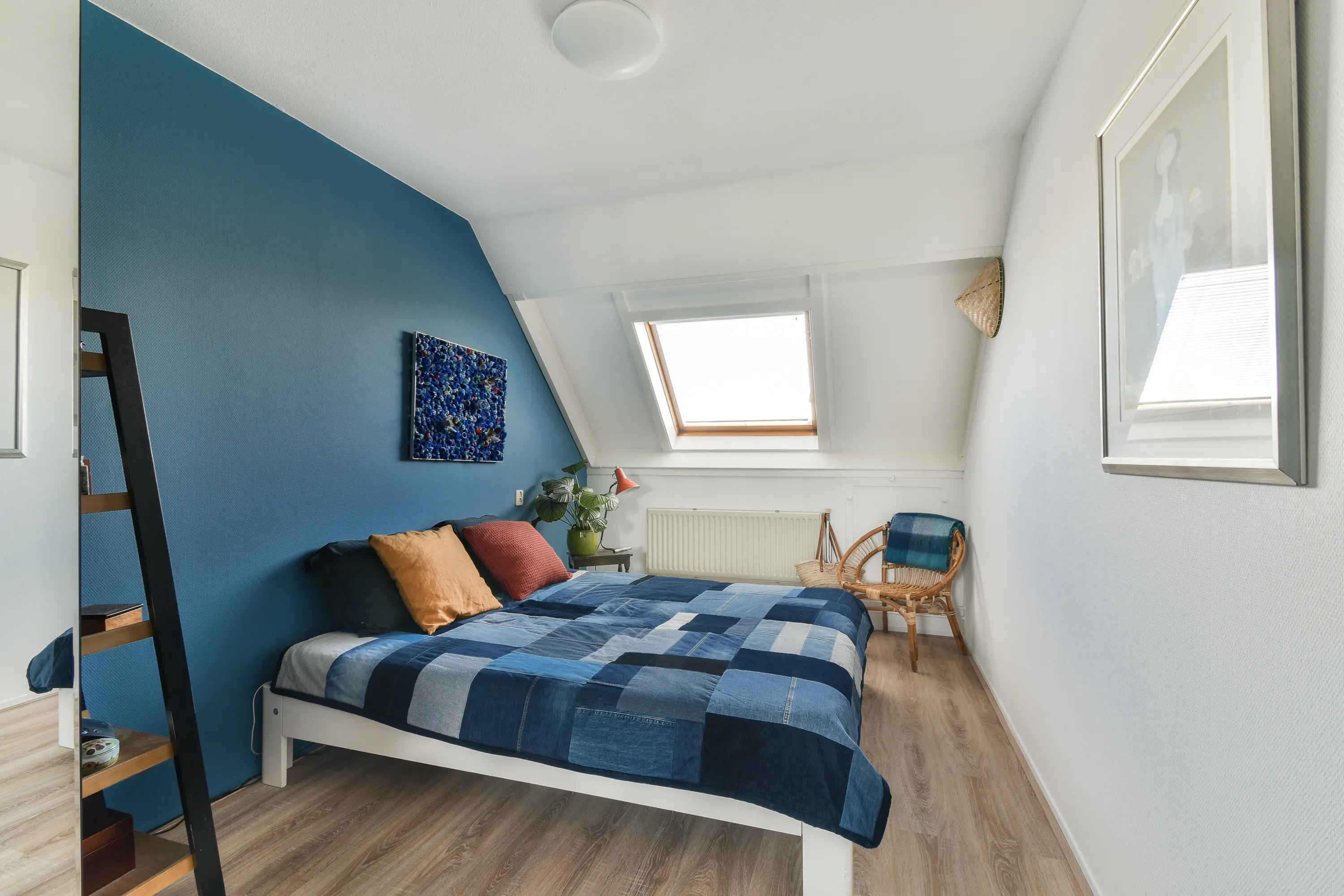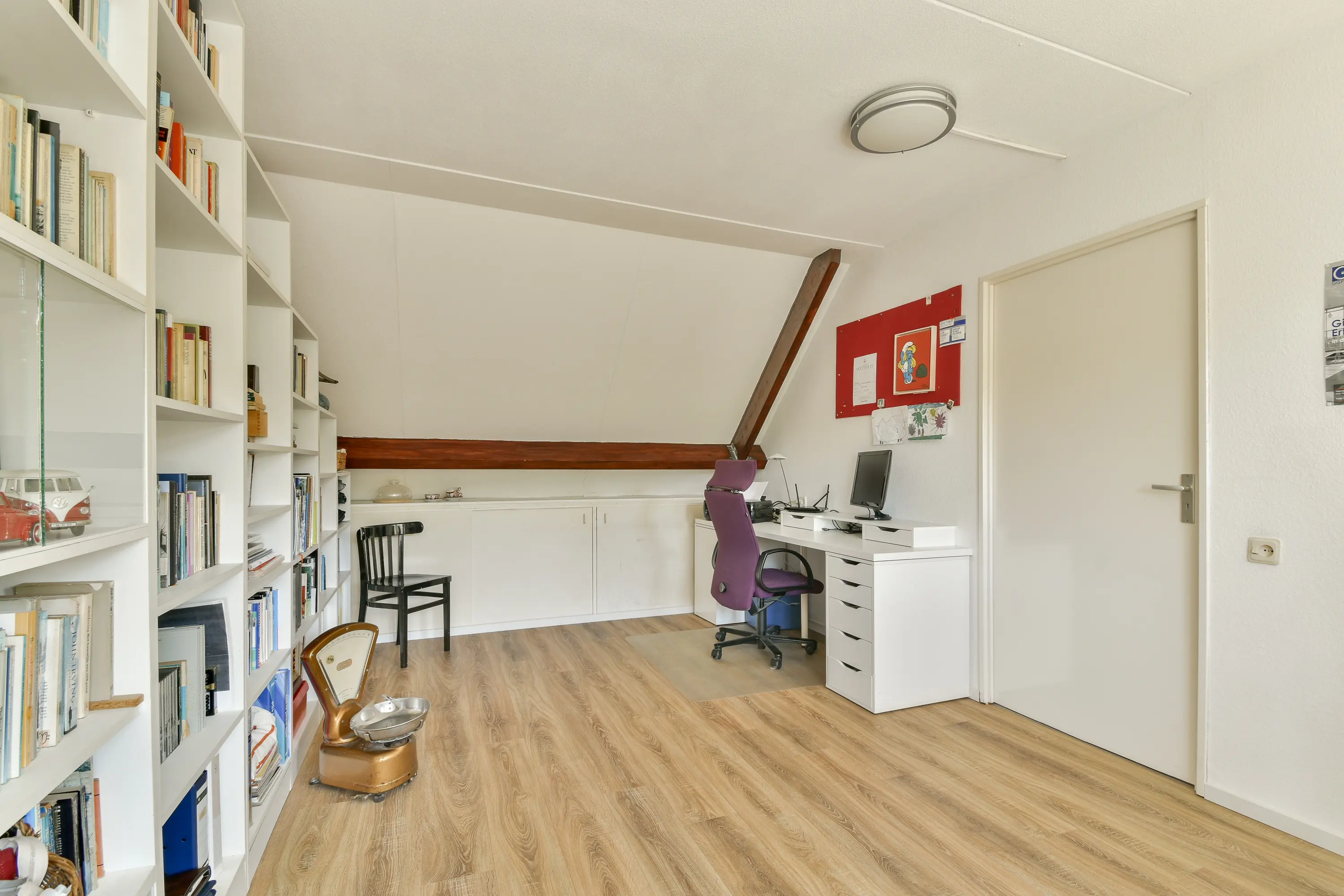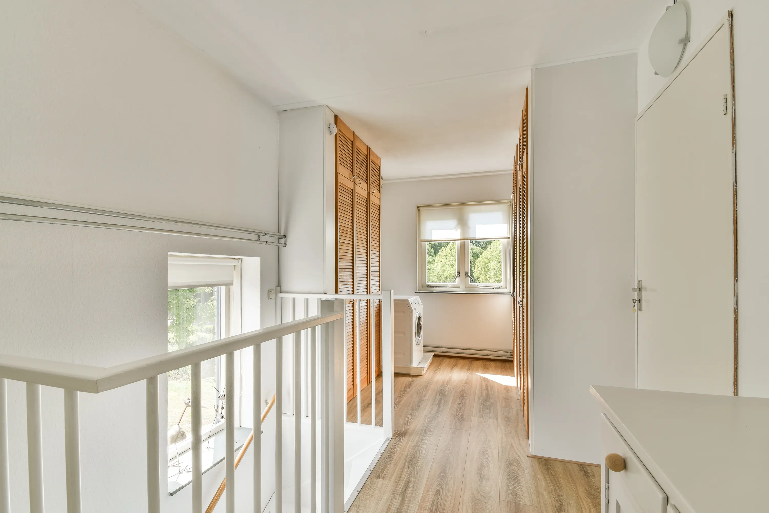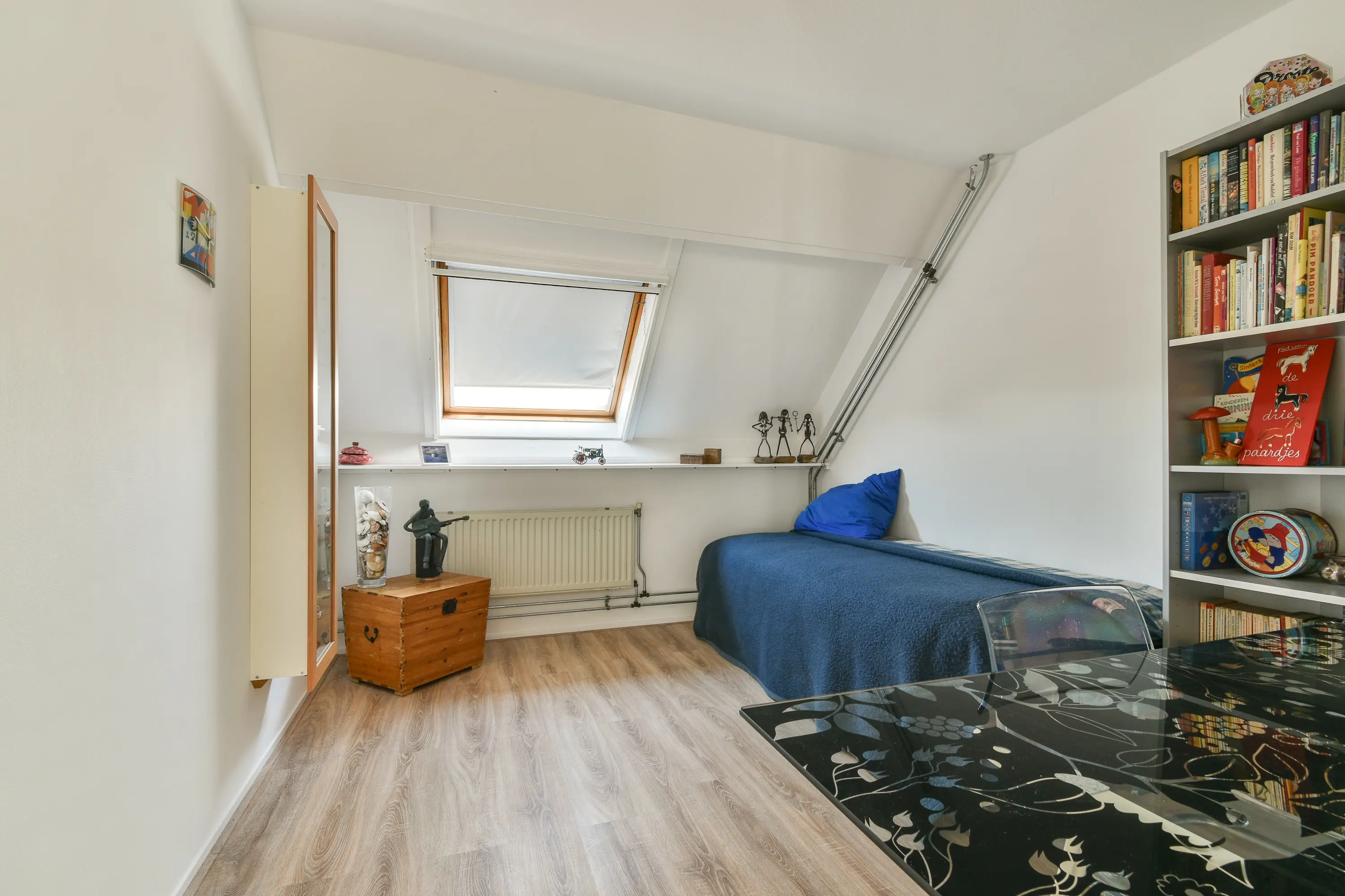 De tweede verdieping biedt een vierde, ruime slaapkamer met veel lichtinval. Daarnaast is hier een wasruimte met aansluitingen voor wasmachine en droger, evenals extra bergruimte achter de knieschotten.