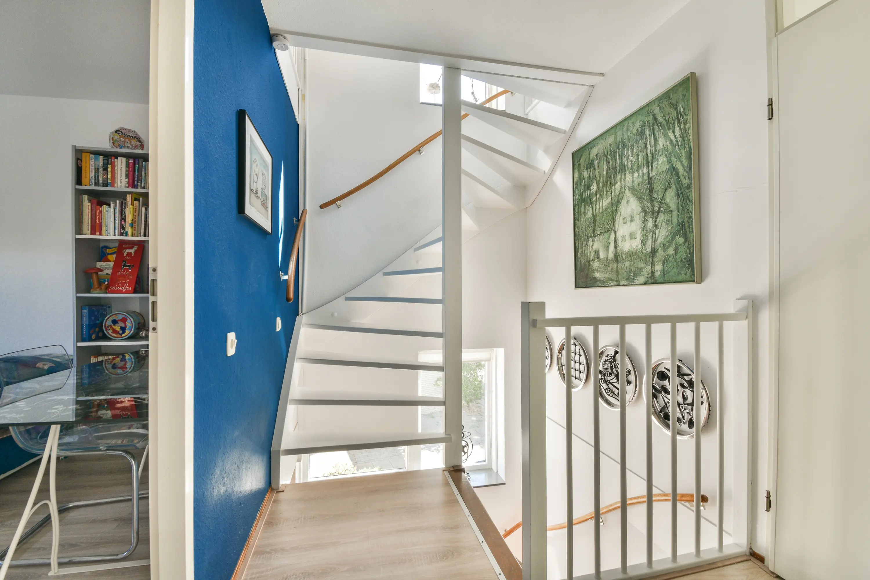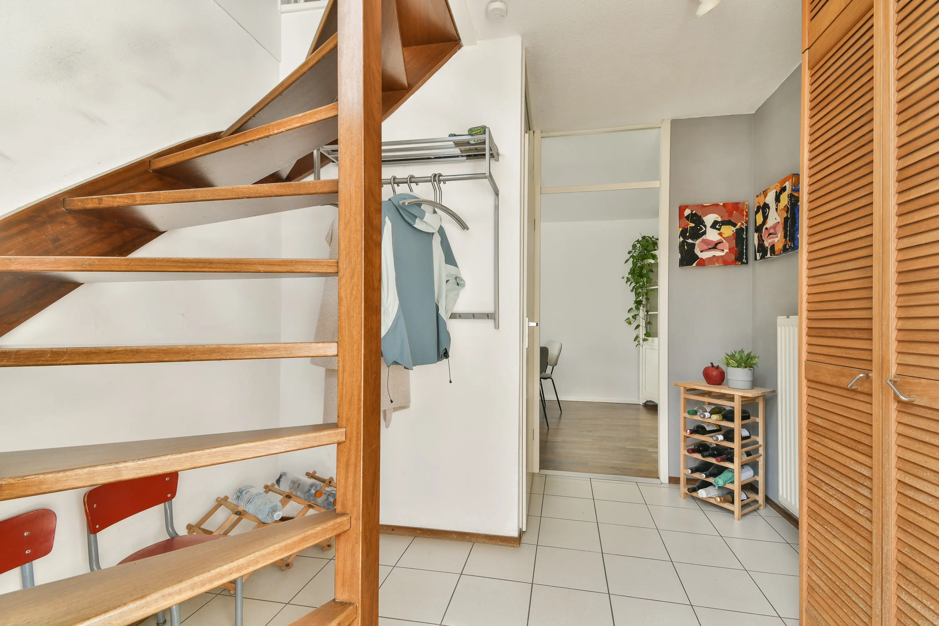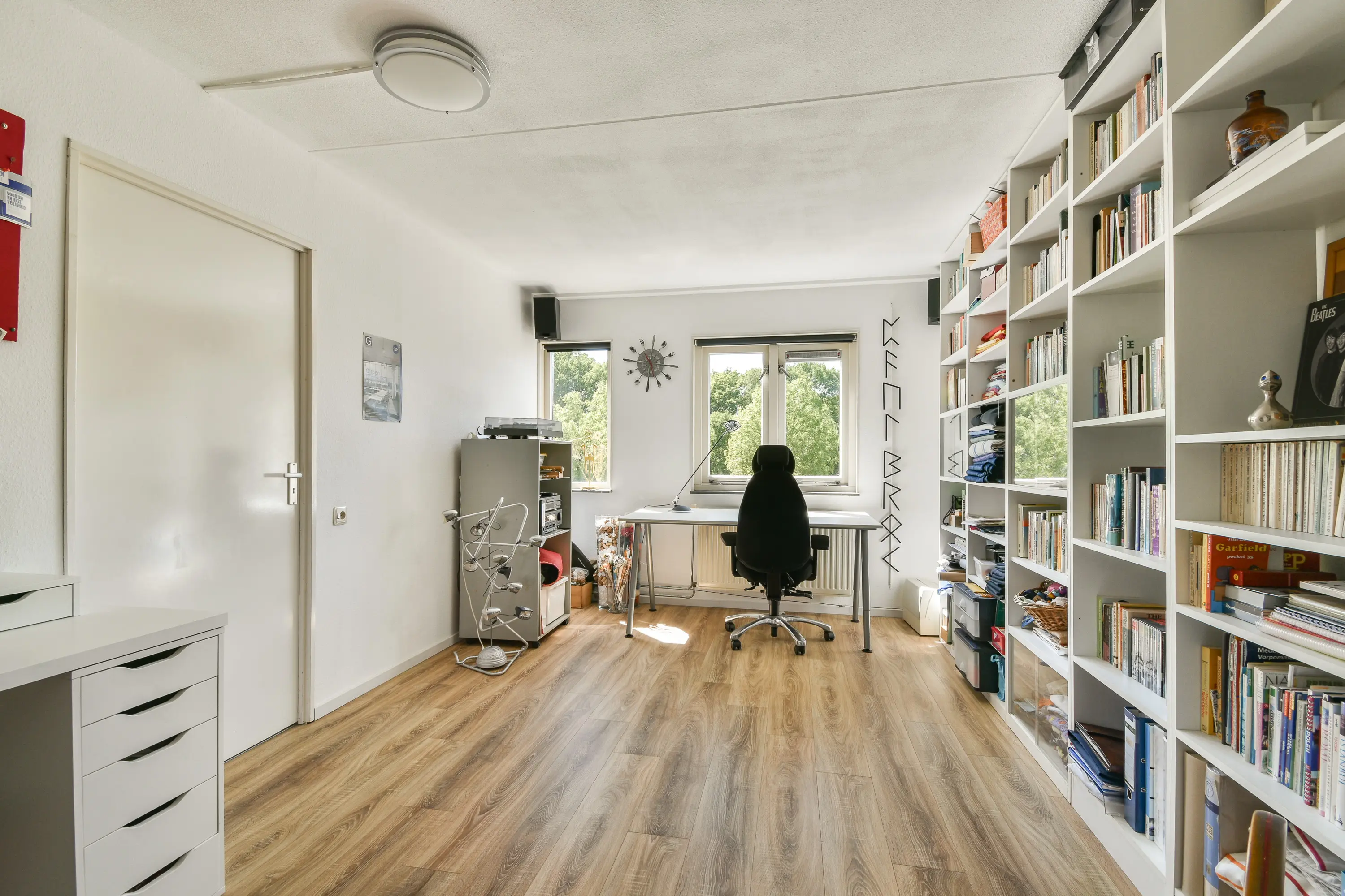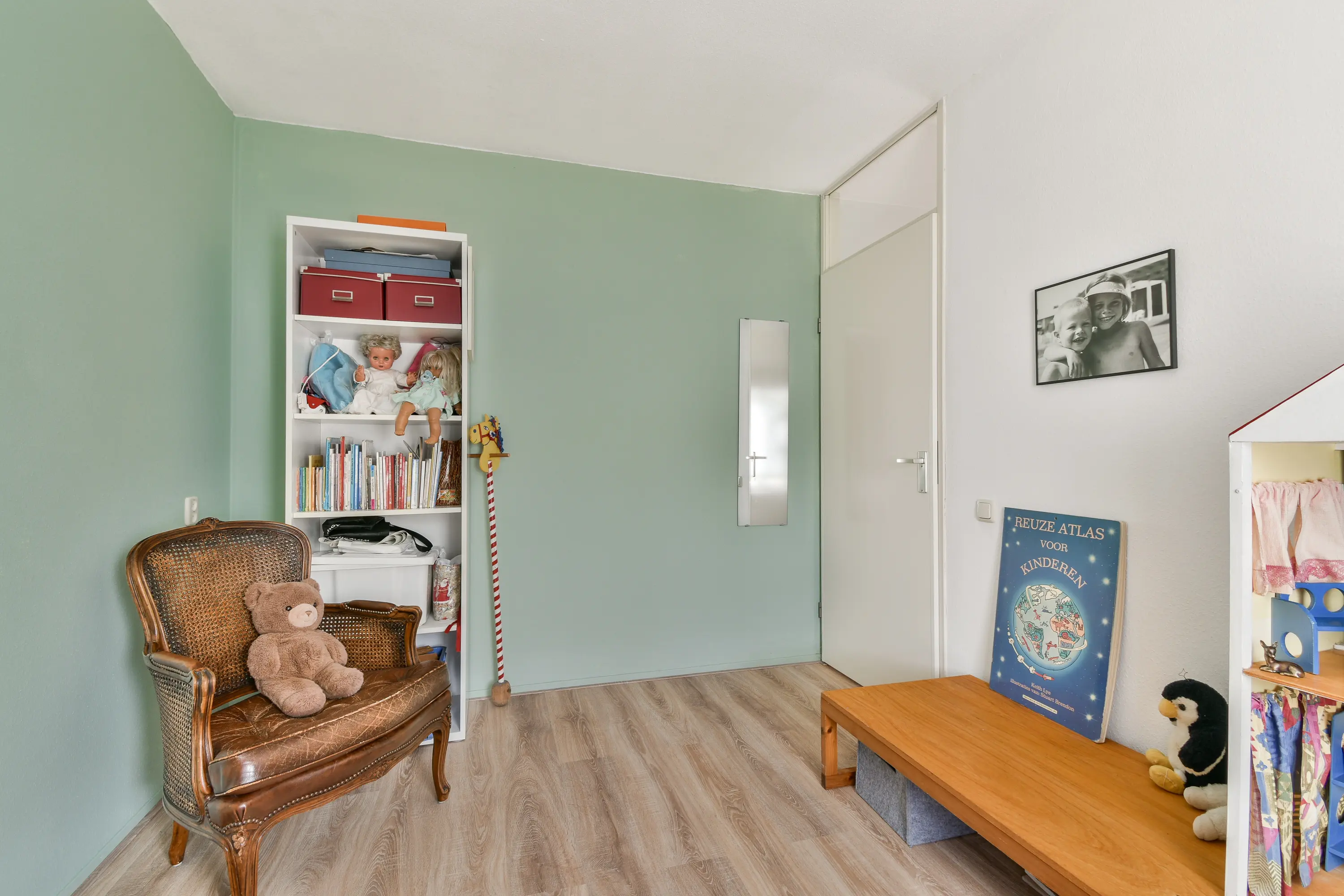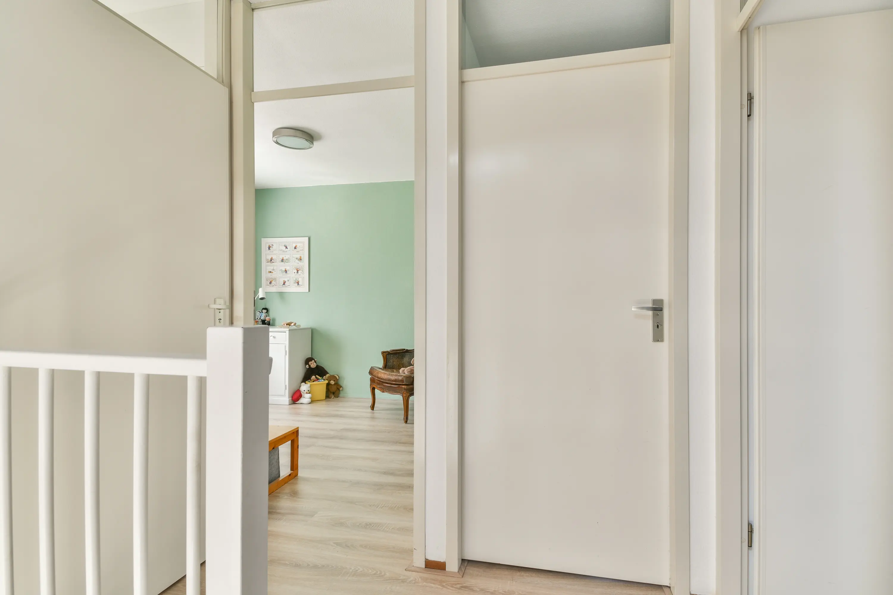 De tweede verdieping biedt een vierde, ruime slaapkamer met veel lichtinval. Daarnaast is hier een wasruimte met aansluitingen voor wasmachine en droger, evenals extra bergruimte achter de knieschotten.