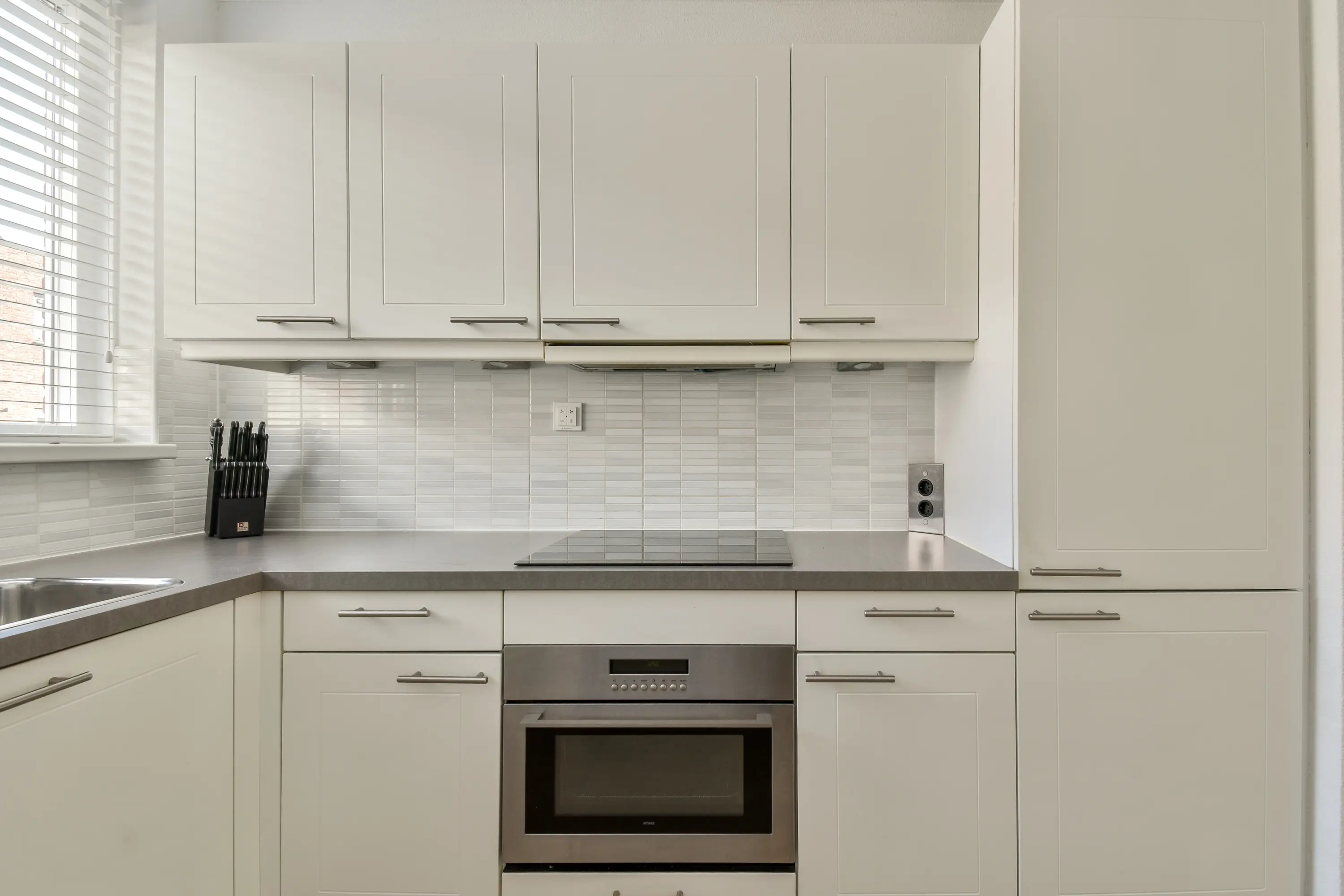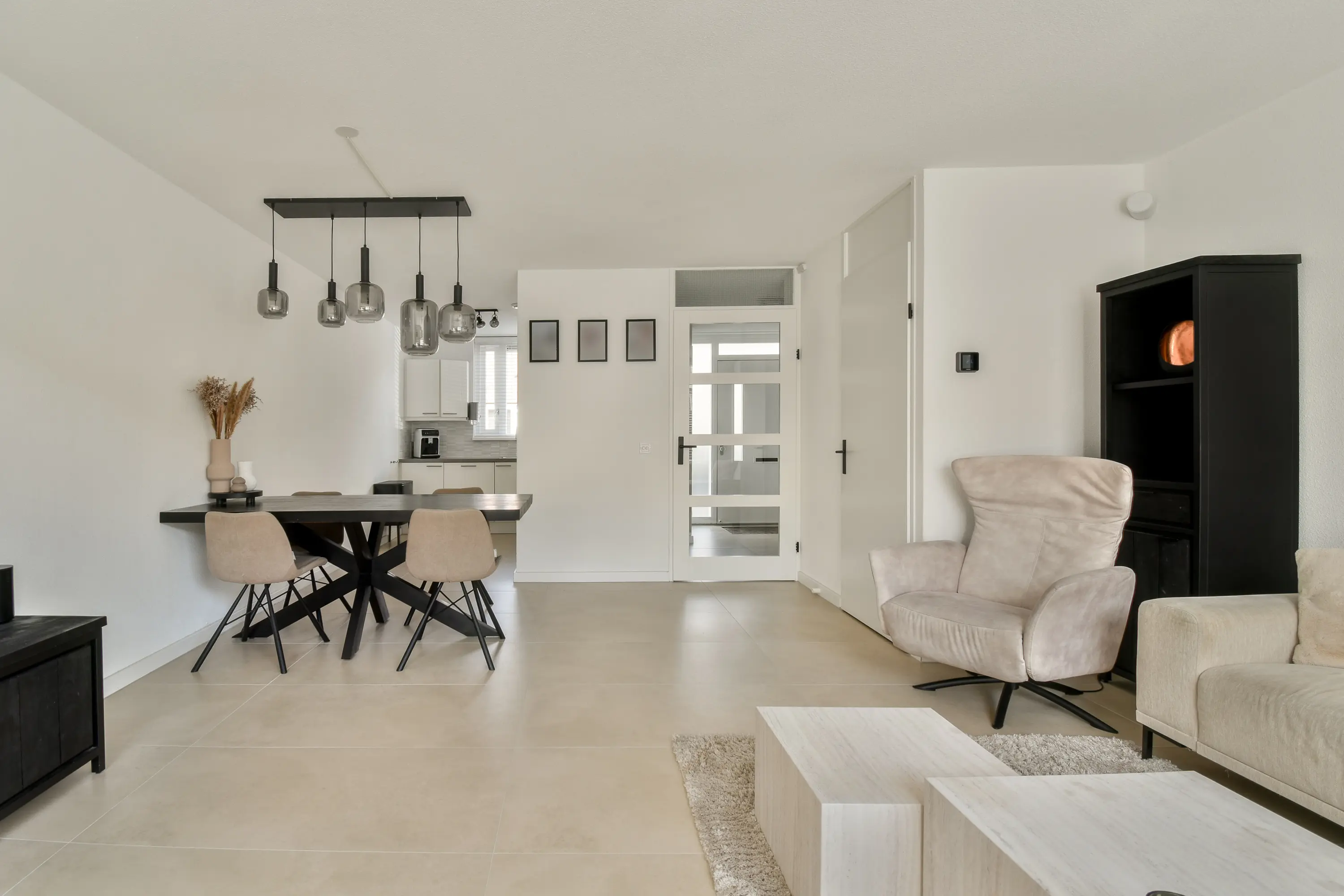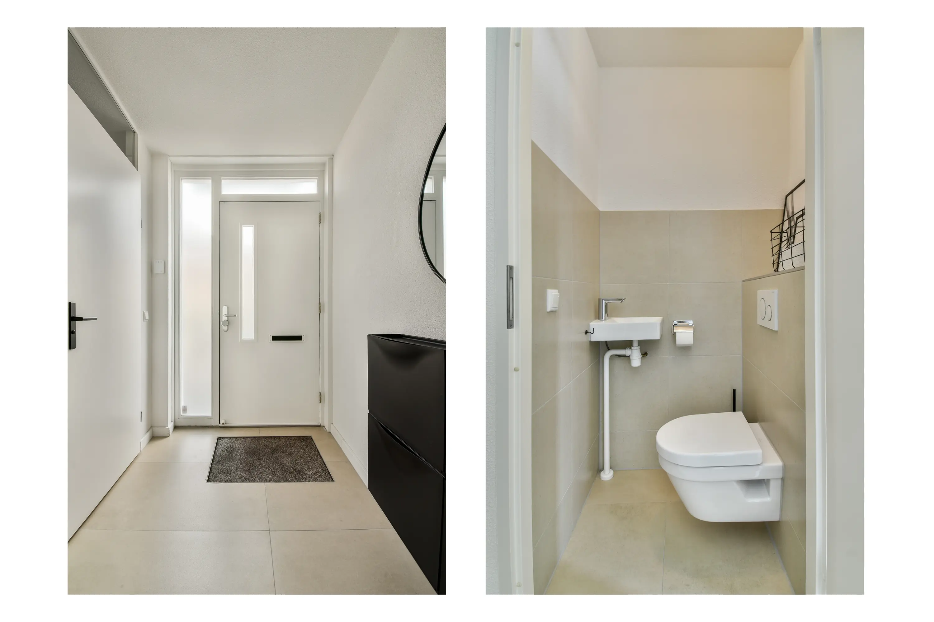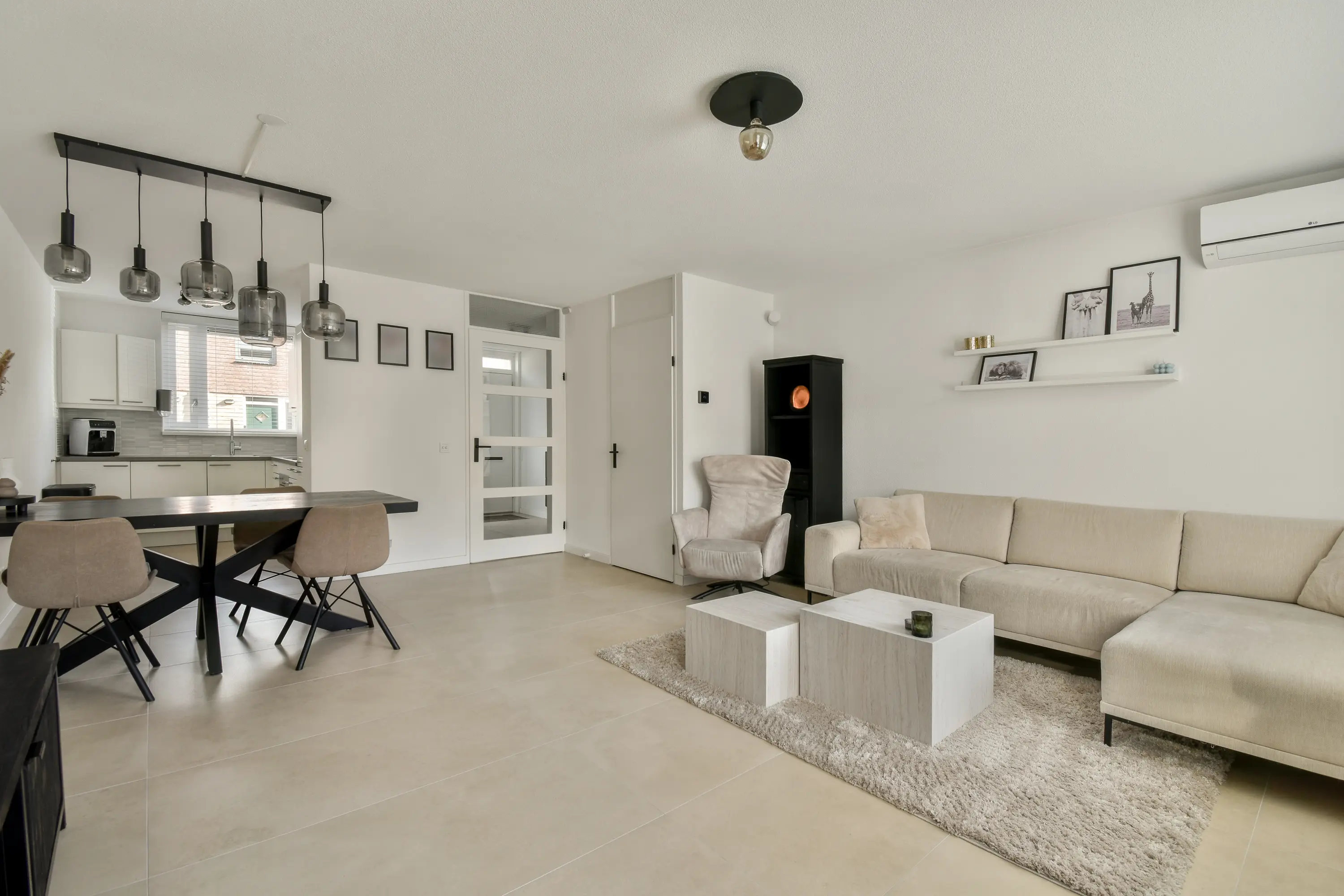 Ruime entree met meterkast, modern betegeld toilet voorzien van een fonteintje met automatische kraan, trapopgang naar de eerste verdieping en toegang tot de woonkamer. De lichte woonkamer is voorzien van plavuizen met vloerverwarming en airconditioning, waardoor het er in elk seizoen aangenaam vertoeven is. Het zitgedeelte biedt een prettig uitzicht op de zonnige tuin en voldoende ruimte voor een gezellige eethoek. Aan de voorzijde bevindt zich de moderne keuken met koel-vriescombinatie, combi-oven, Quooker, vaatwasser, inductiekookplaat en afzuigkap.