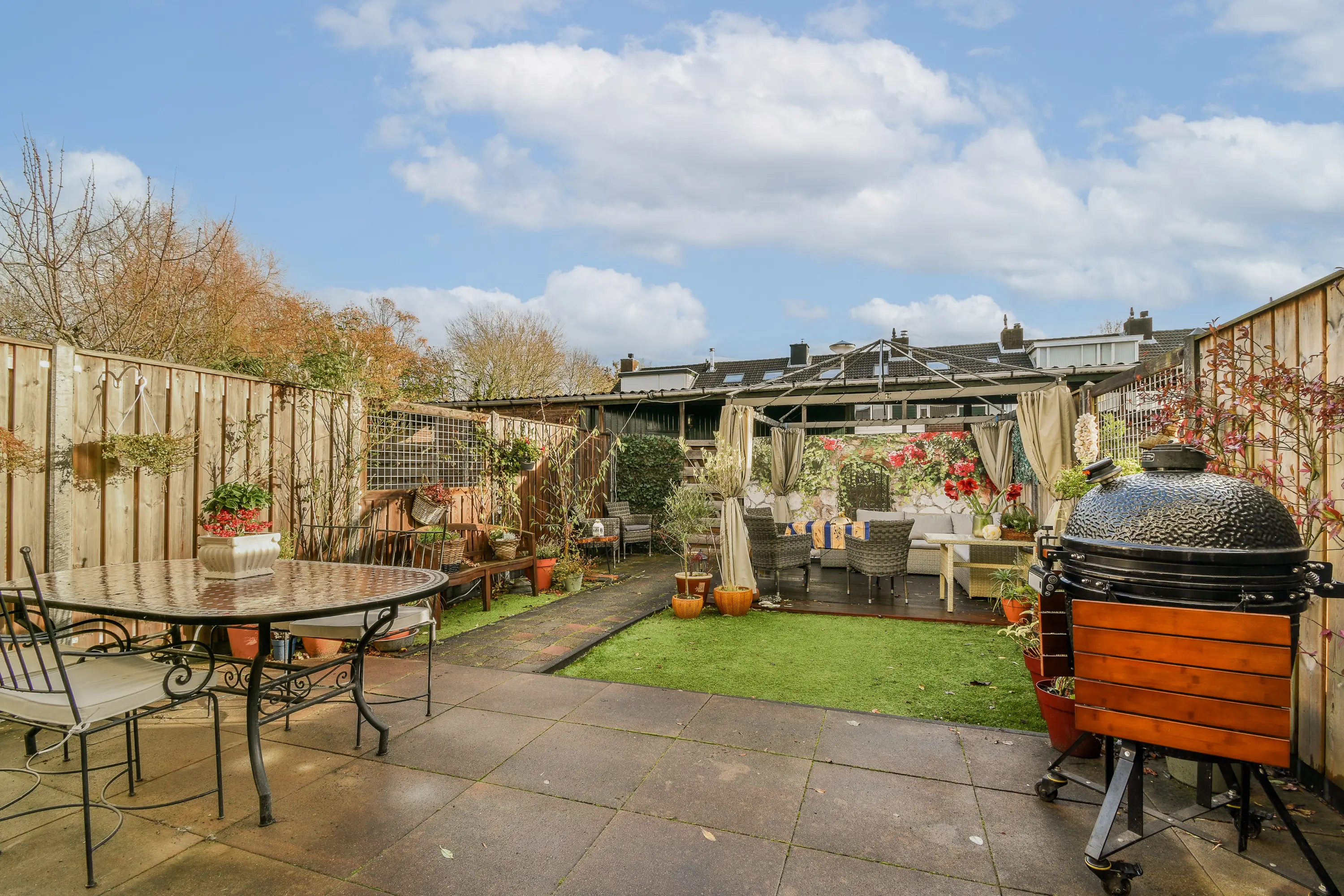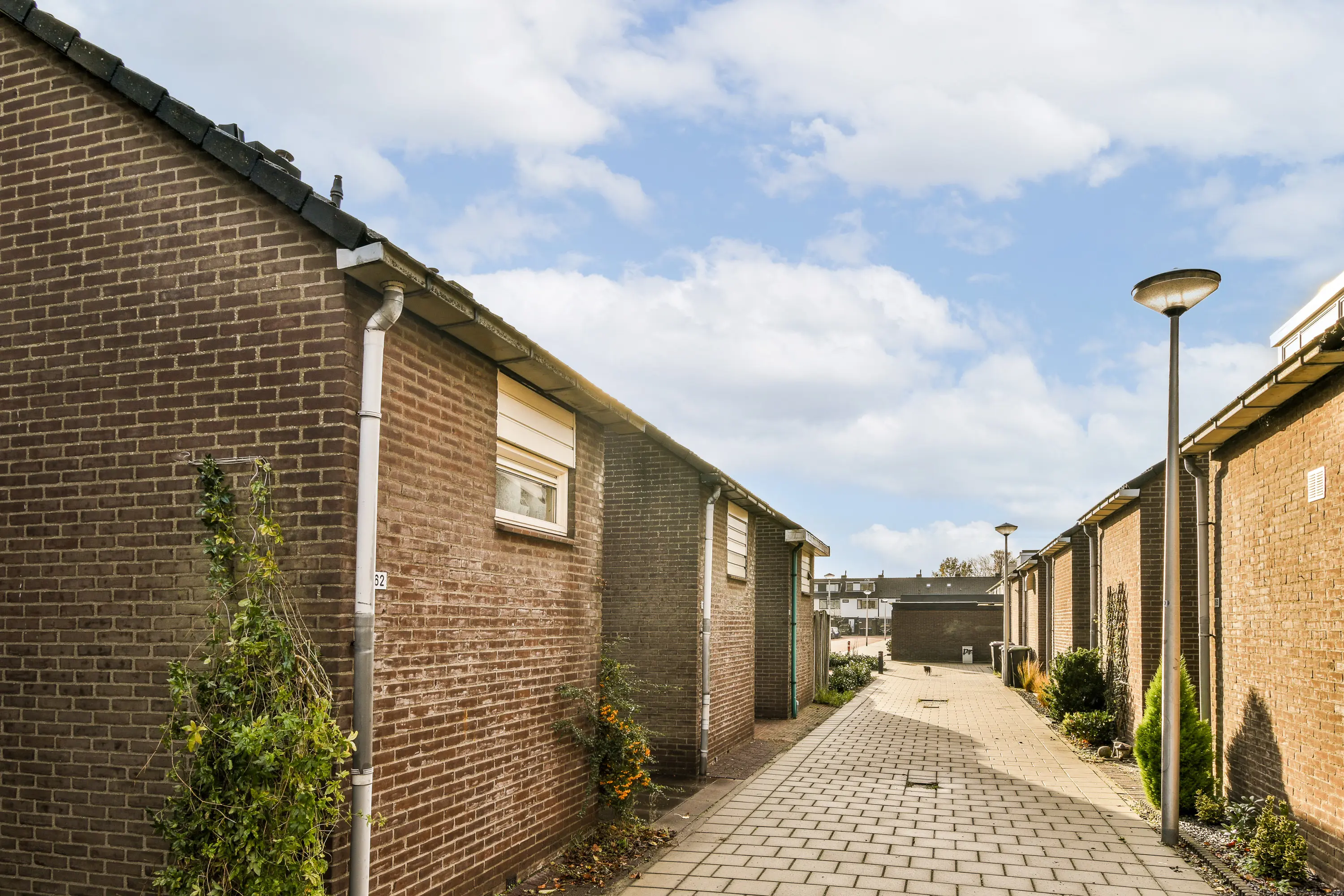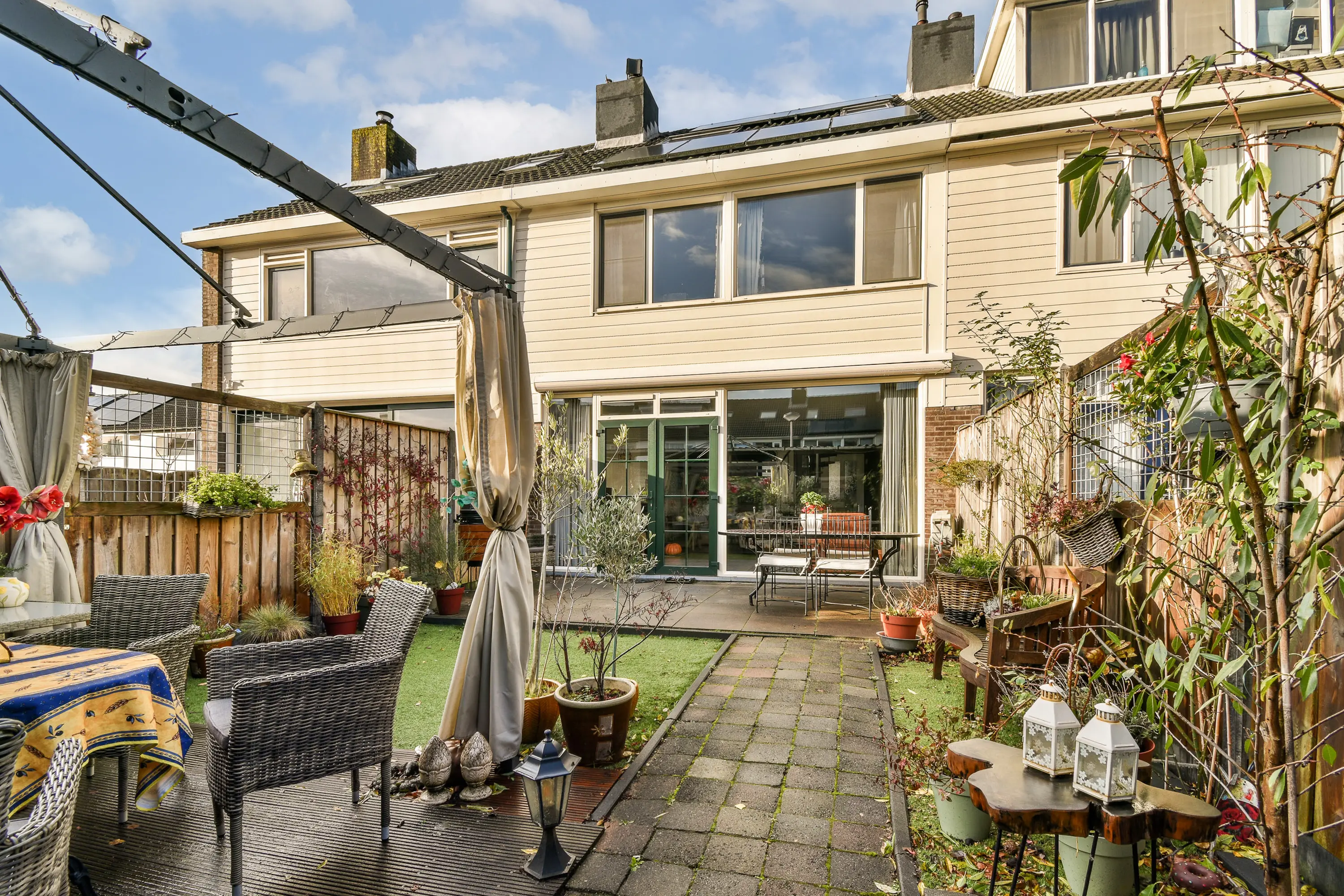 De achtertuin ligt op het noordoosten en is sfeervol en onderhoudsvriendelijk ingericht. Er is een elektrisch zonnescherm aanwezig, evenals een waterpunt en voldoende ruimte voor een lounge- of eetopstelling. De tuin biedt toegang tot de eigen parkeerplaats en de losstaande berging. De berging is voorzien van elektra en verlichting, ideaal voor opslag of hobby’s. Aan de voorzijde van de woning bevindt zich eveneens een kleine voortuin.