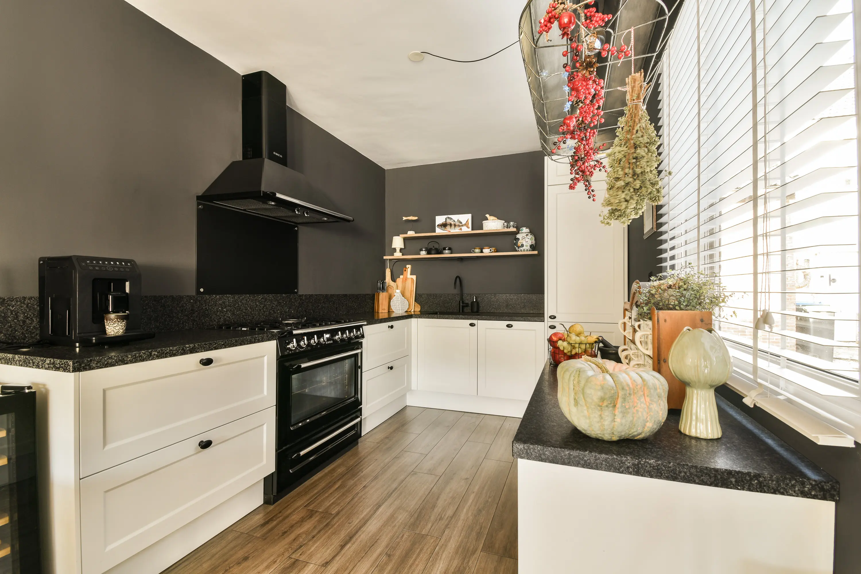 De keuken (2020) ligt aan de voorzijde van de woning en is uitgevoerd in een moderne landelijke stijl. Hier vind je een 5-pits Smeg fornuis met oven, koelkast, vriezer, vaatwasser en een close-in boiler. De plavuizen vloer is praktisch en sfeervol. Dankzij de ruime werkbladen en vele opbergmogelijkheden is dit een keuken waar koken echt een plezier is.