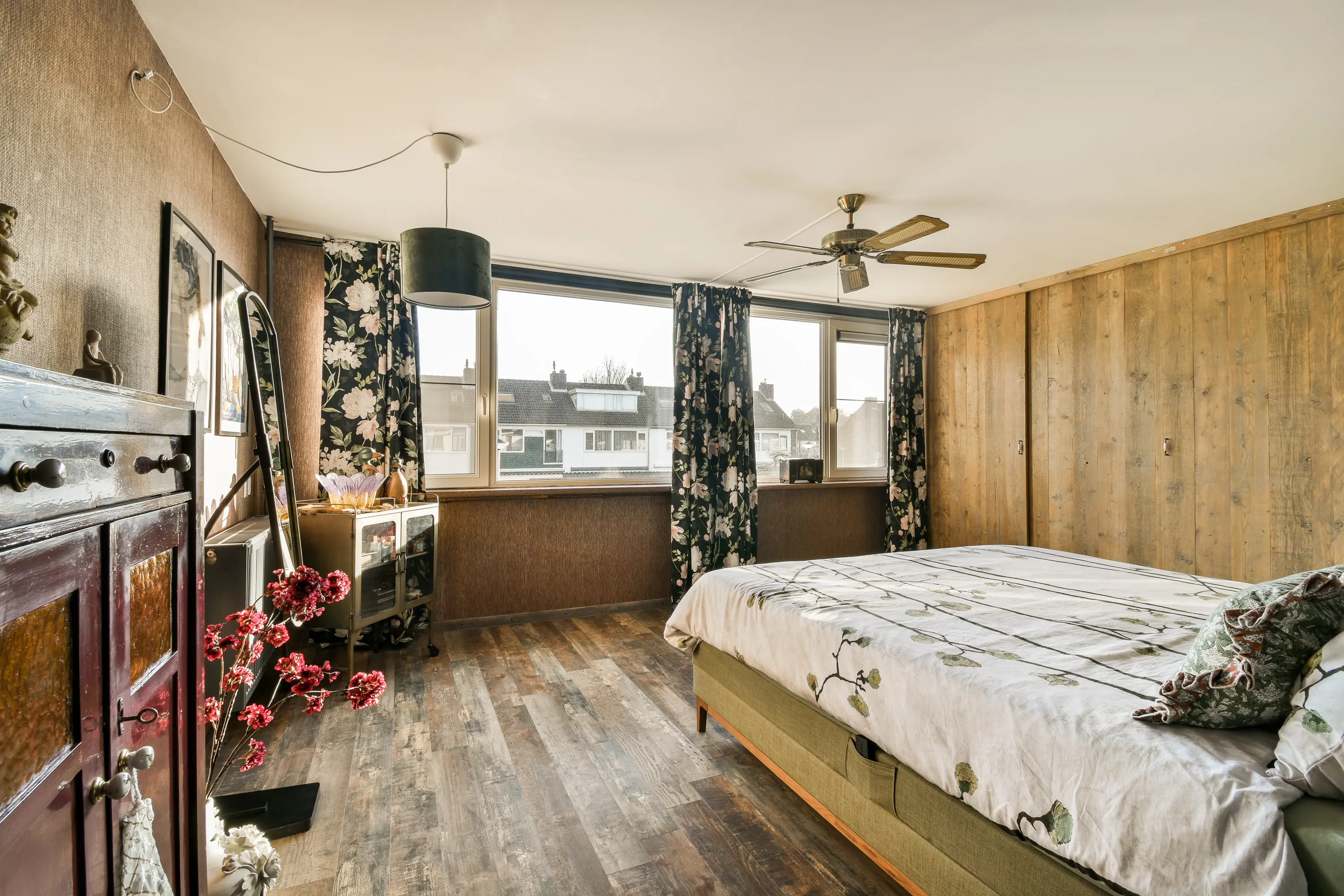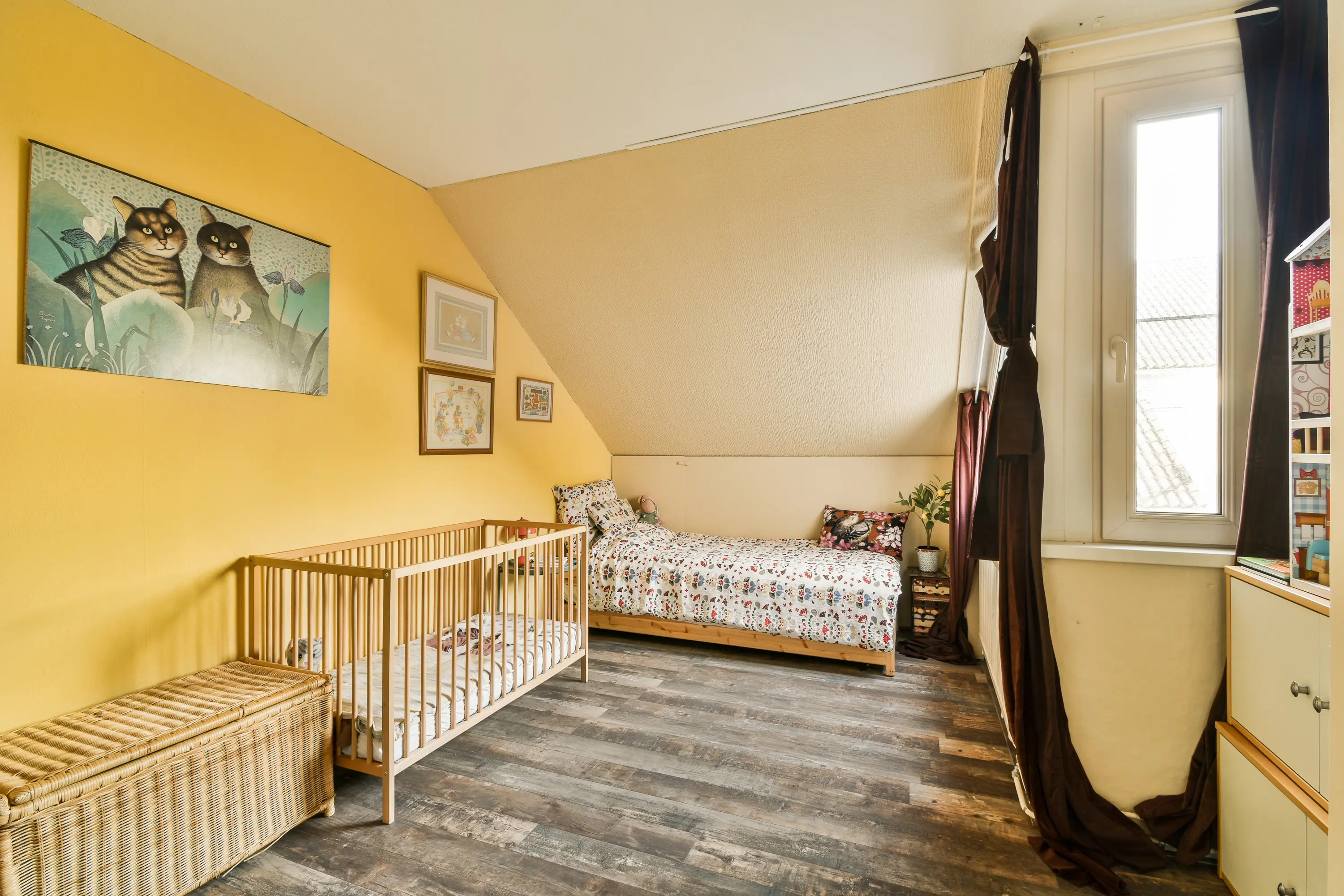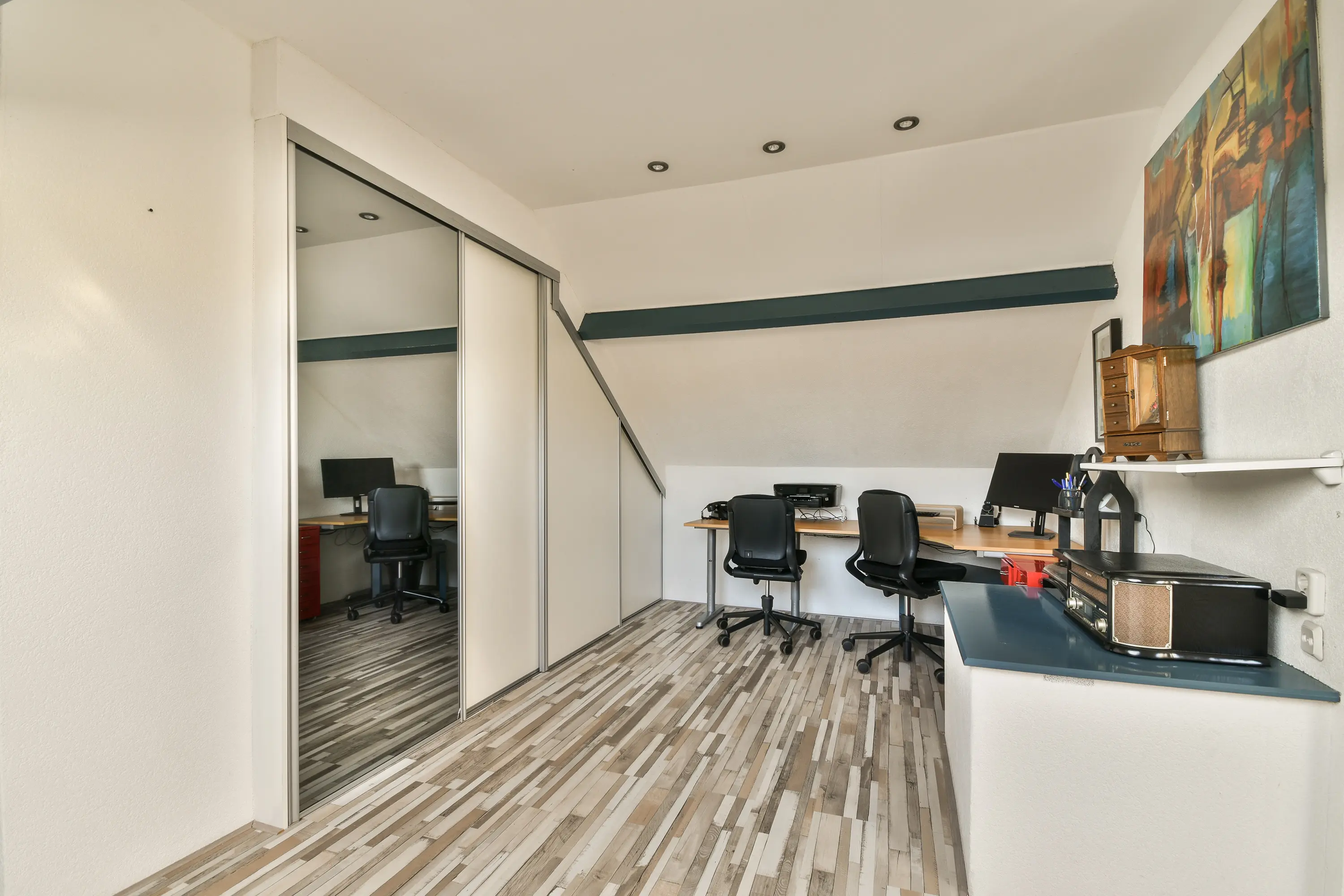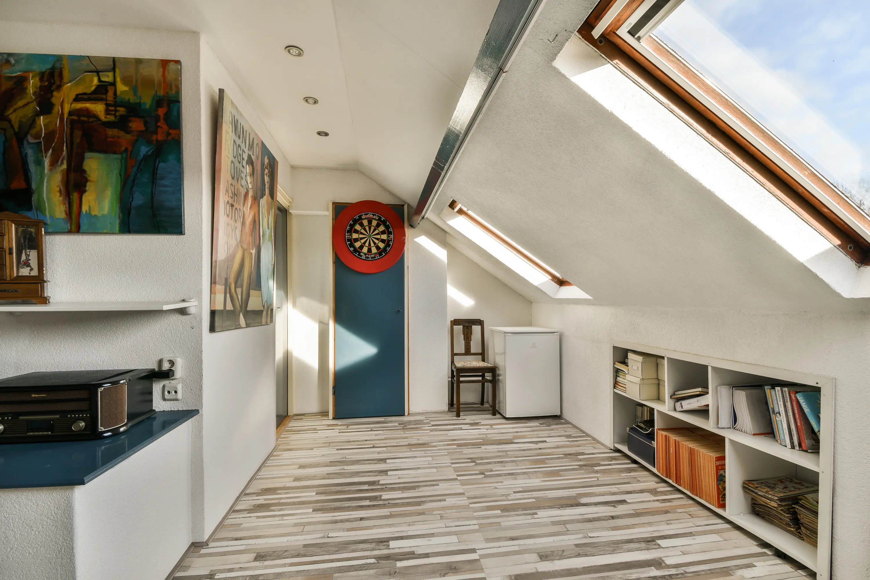 De zolderverdieping is ingericht als derde slaapkamer en voelt dankzij twee Velux dakramen en de ruime indeling als een volwaardige verdieping. Hier zijn vaste kasten aanwezig en is er een aparte ruimte voor de wasmachine en droger, evenals de mechanische ventilatie. De verdieping is netjes afgewerkt met laminaat en biedt veel bergruimte onder de schuine daken.