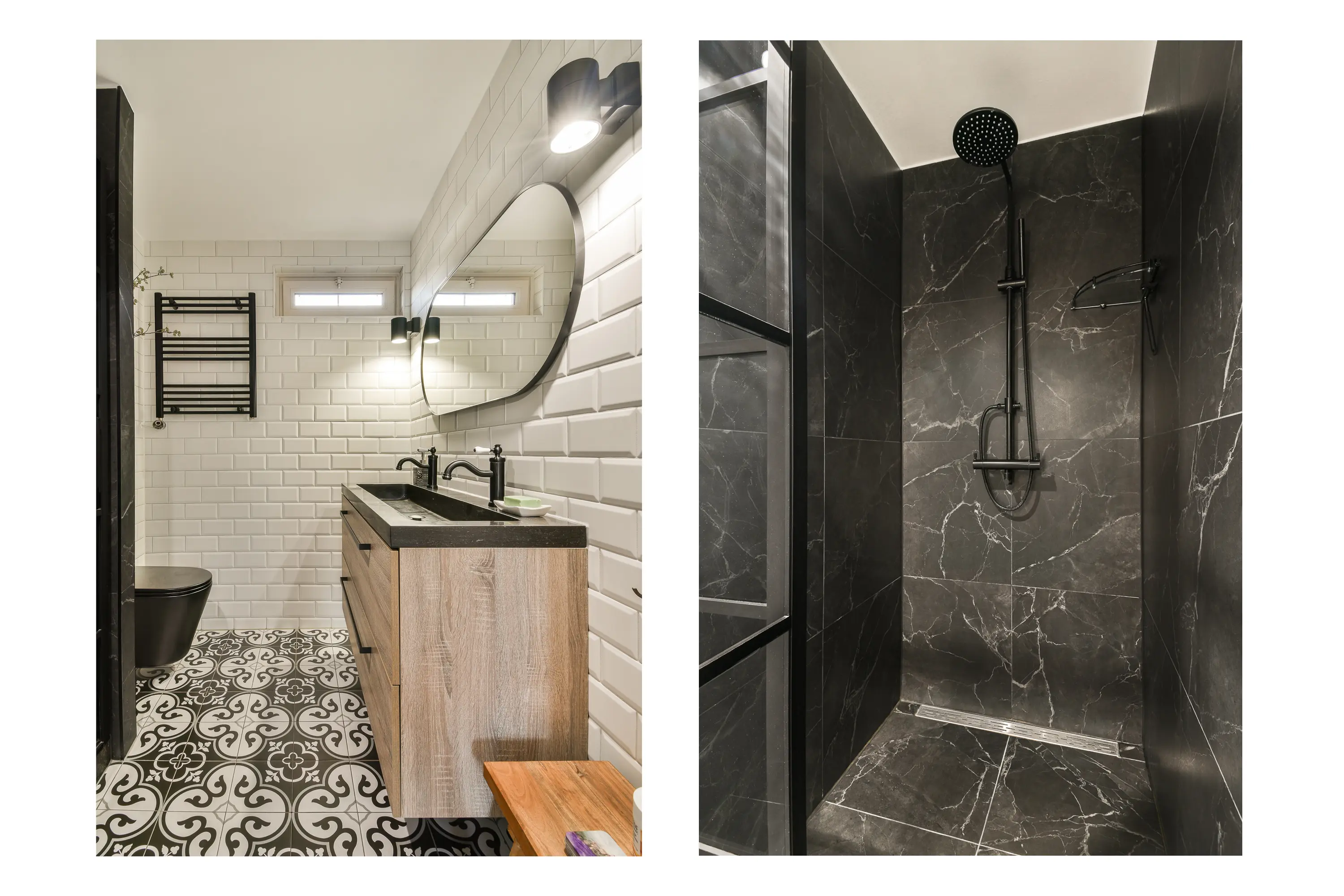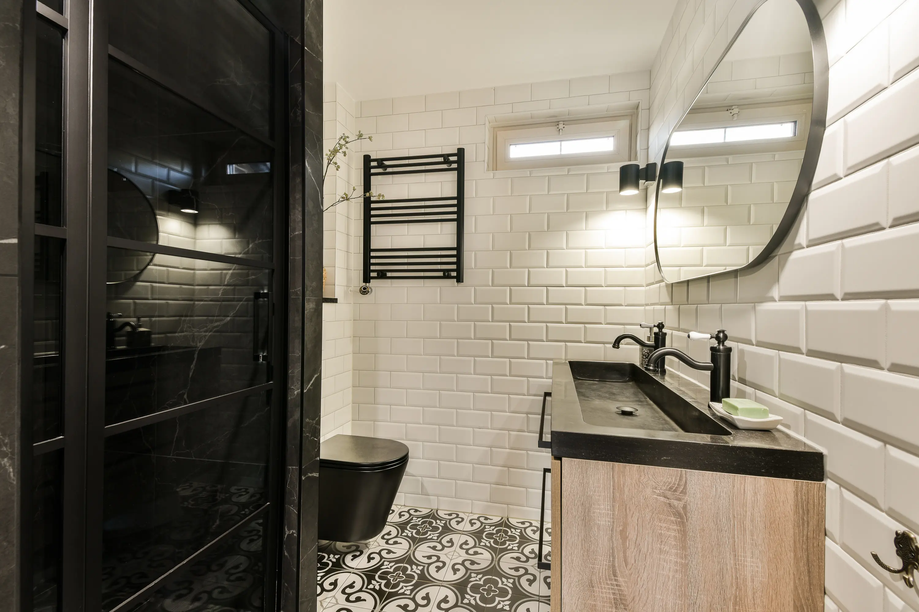 De badkamer is in 2022 volledig vernieuwd en luxueus afgewerkt. De ruimte beschikt over een dubbele wastafel, moderne inloopdouche met regendouche, toilet en een raam voor natuurlijke ventilatie. De combinatie van witte wandtegels en donkere details geeft de badkamer een eigentijdse uitstraling.