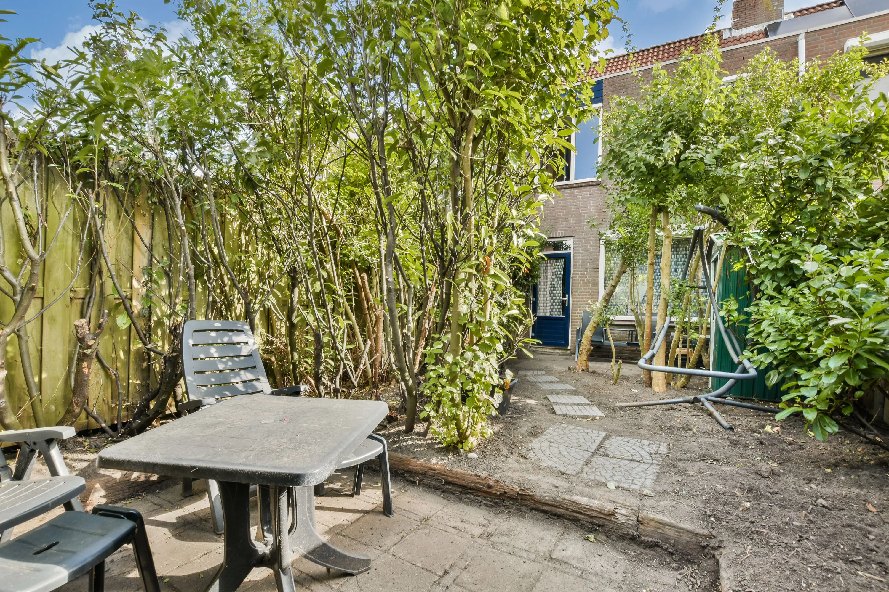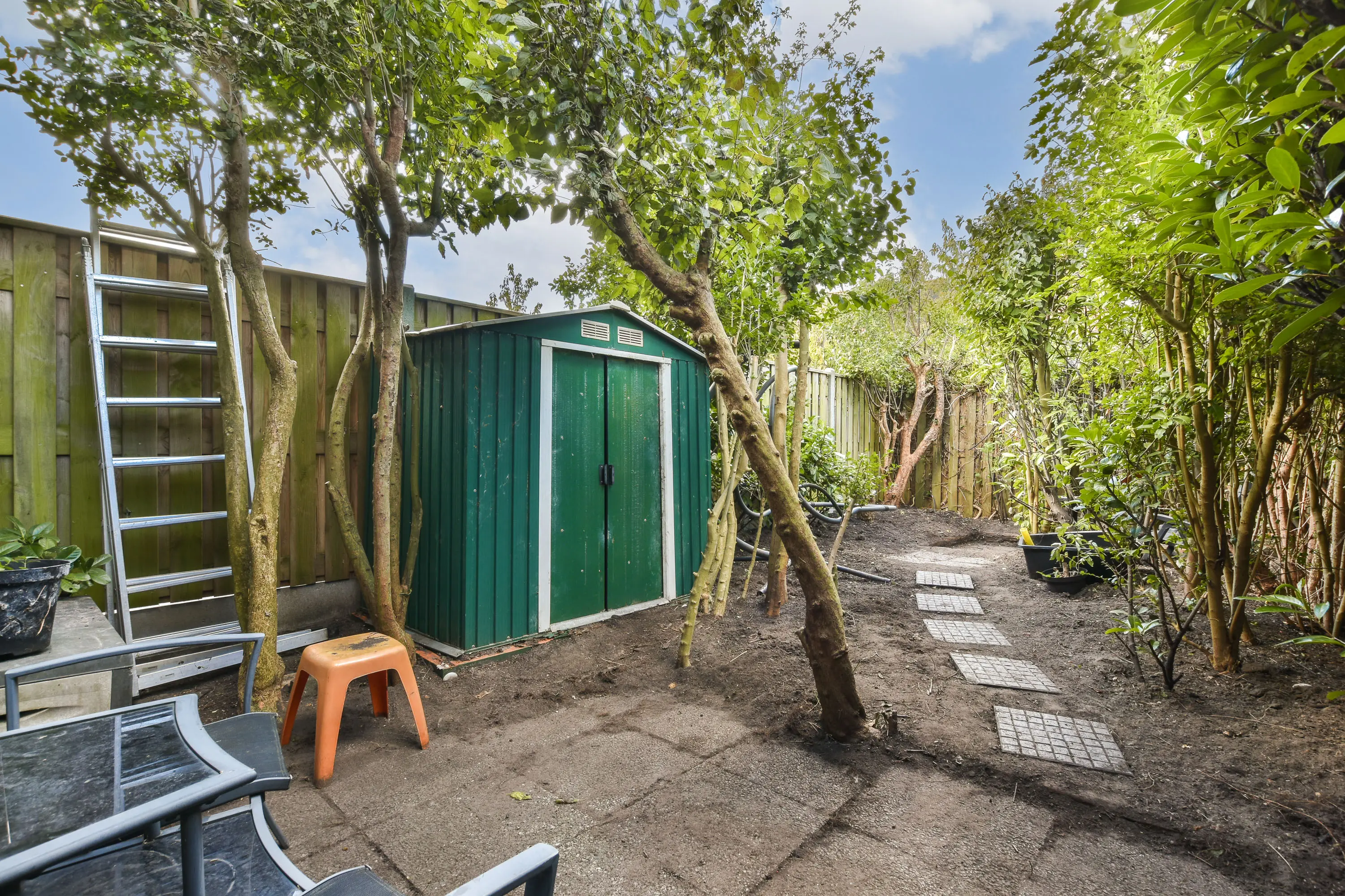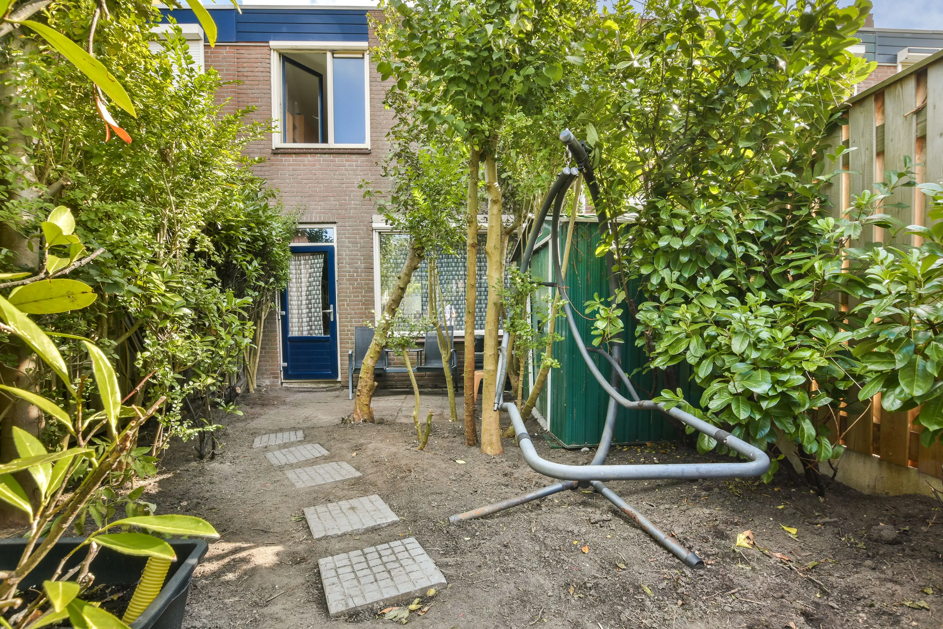 De achtertuin is gelegen op het westen en biedt veel privacy. Aan de voorzijde bevindt zich de berging.