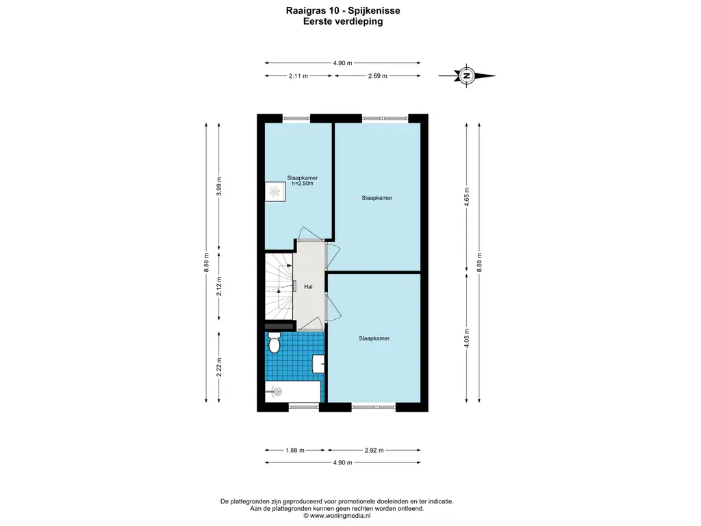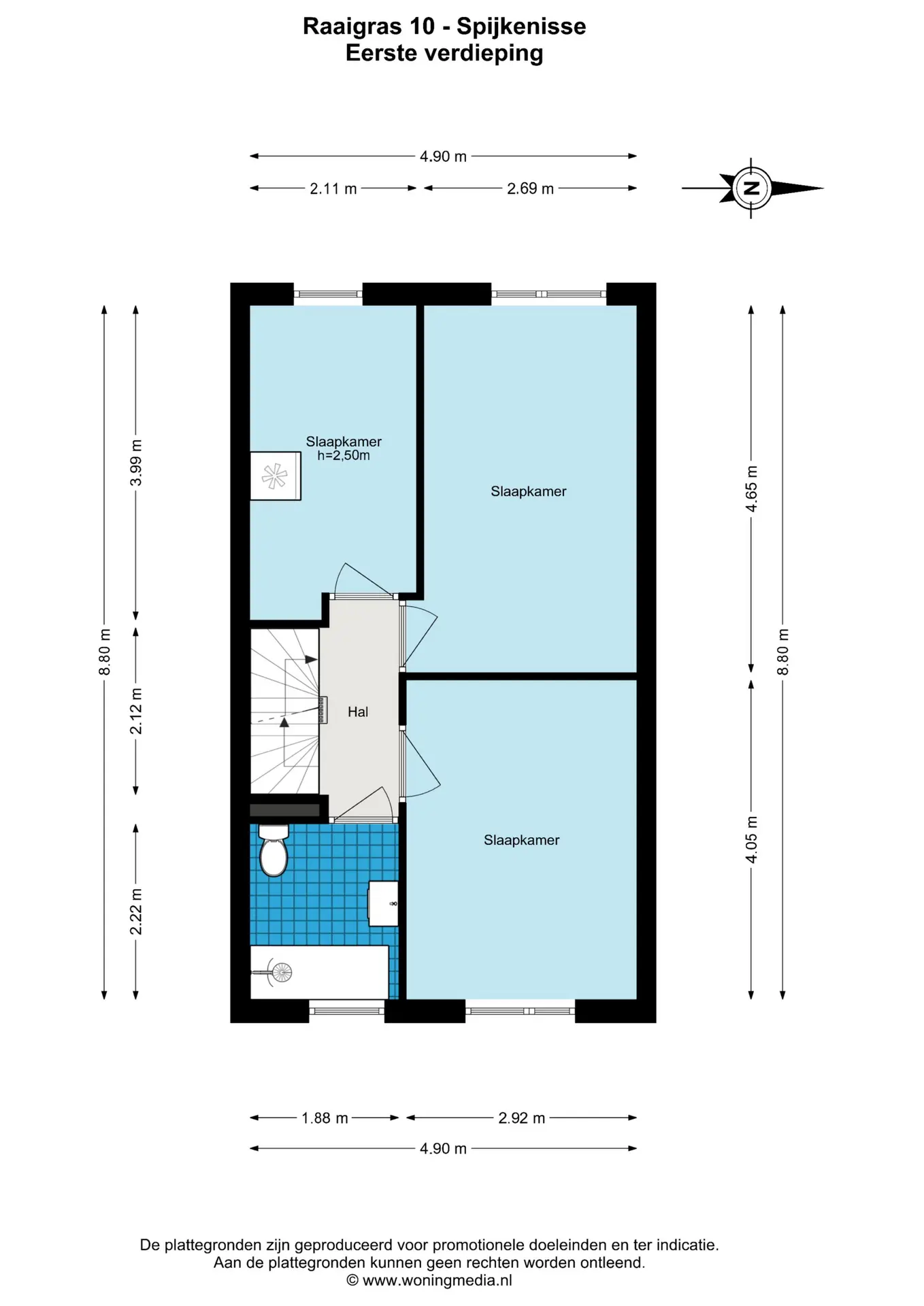 De overloop biedt toegang tot drie slaapkamers, allen voorzien van kantel-kiepramen. De badkamer beschikt over een ligbad met douche, toilet, wastafel en natuurlijke ventilatie.