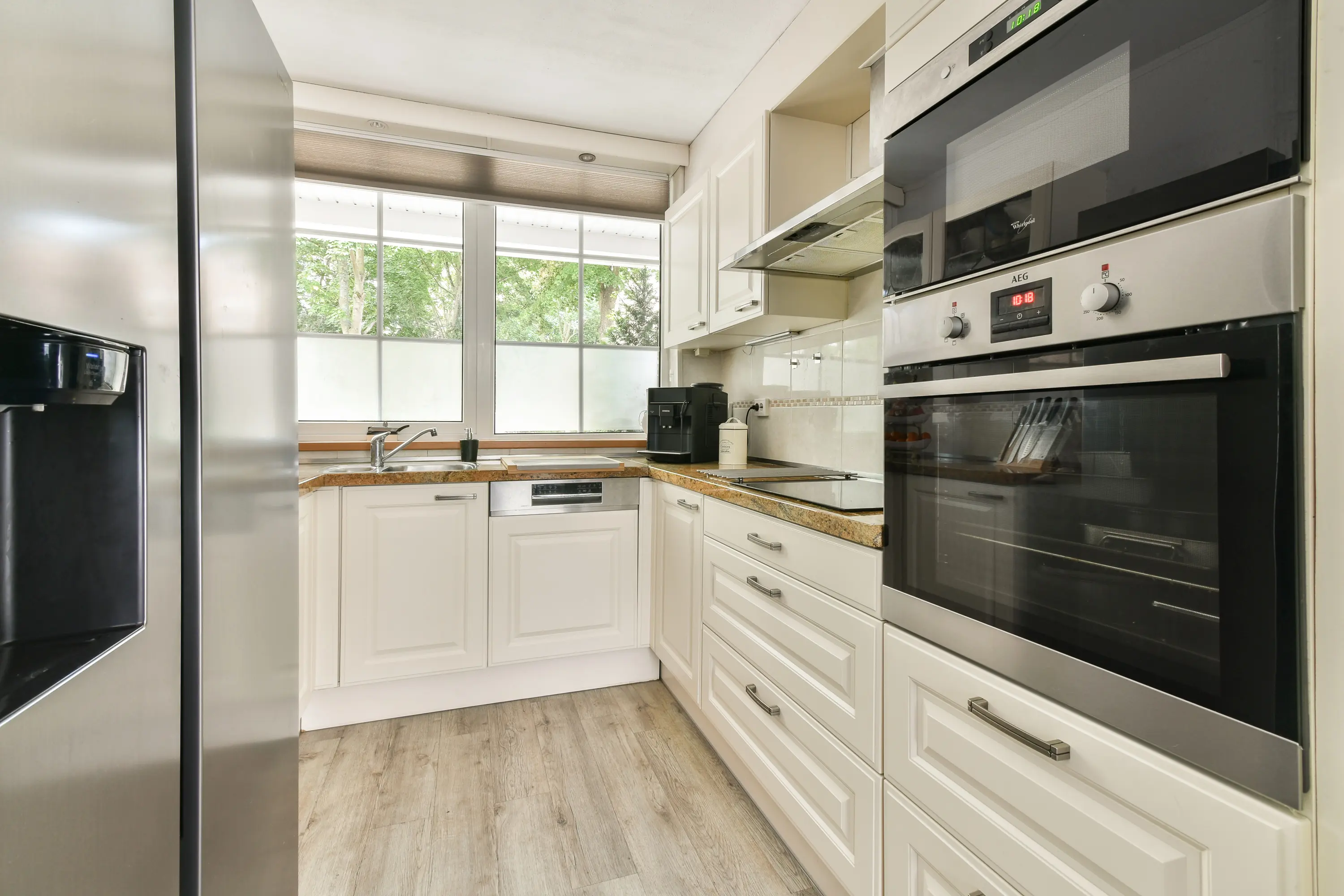 Binnenkomst in de hal met garderobe, meterkast en toilet. De tuingerichte woonkamer is ruim en licht, met een fijne zithoek en ruimte voor een grote eettafel. Aan de voorzijde van de woning bevindt zich de halfopen keuken met landelijke uitstraling, voorzien van alle wenselijke inbouwapparatuur, waaronder een inductiekookplaat, vaatwasser, oven, combimagnetron en een Amerikaanse koelkast.