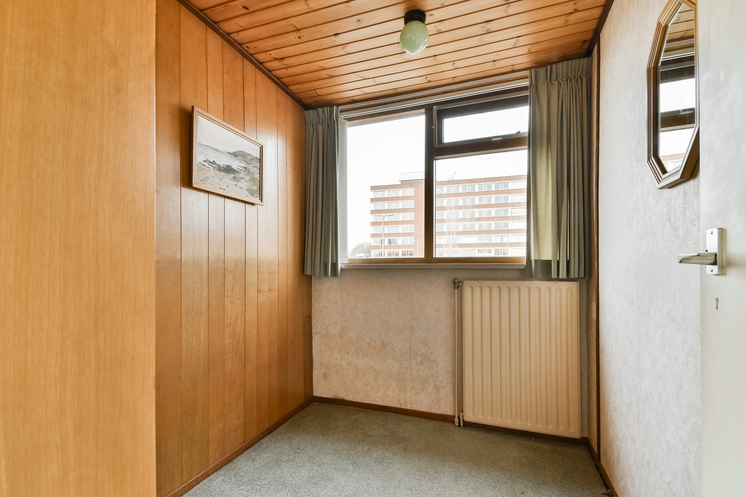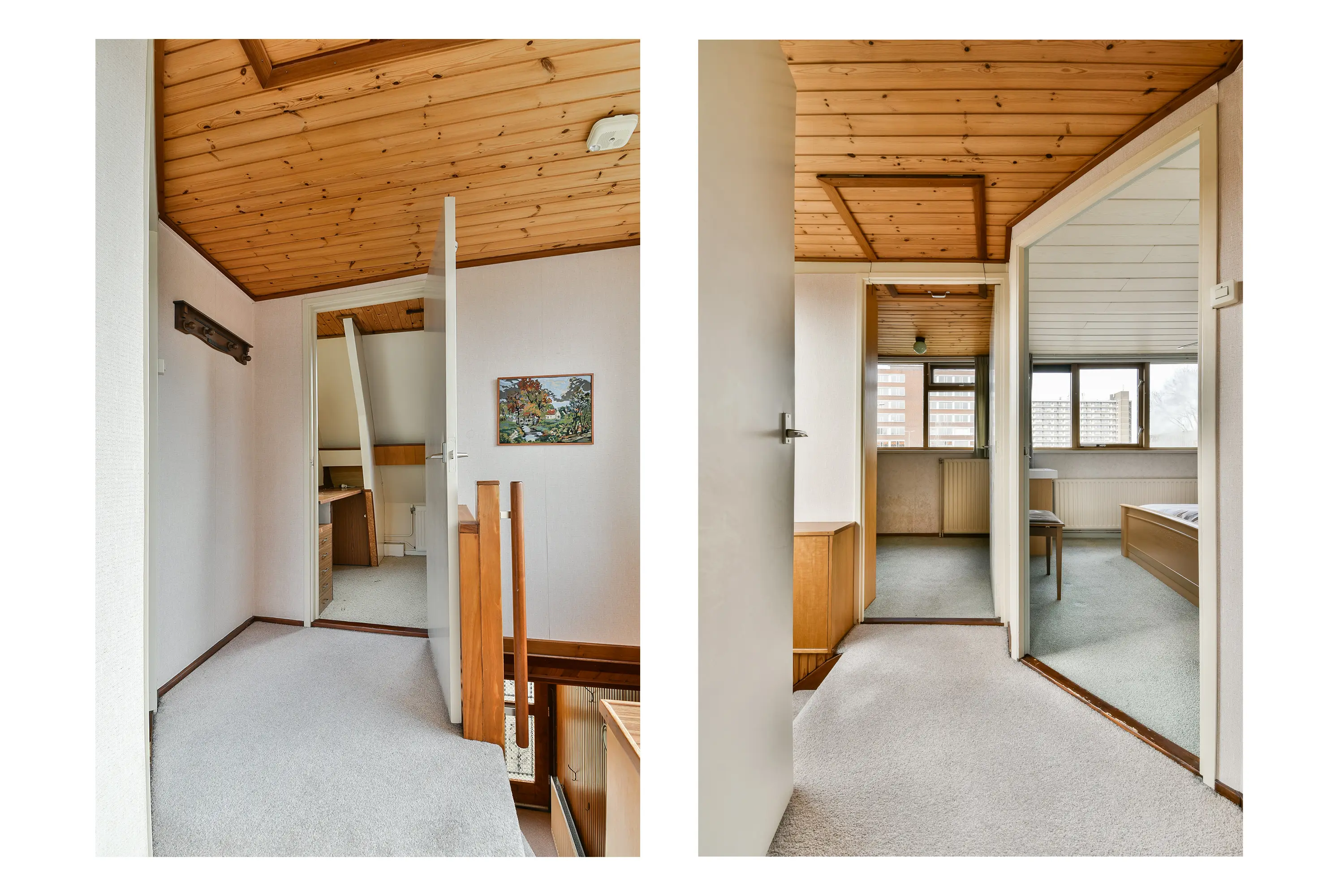 De tweede slaapkamer beschikt over vloerbedekking en een Velux dakraam met dubbel glas, dan is er nog de derde slaapkamer, deze bevindt zich aan de achterzijde van de woning en is voorzien van vloerbedekking en houten kozijnen met dubbel glas.