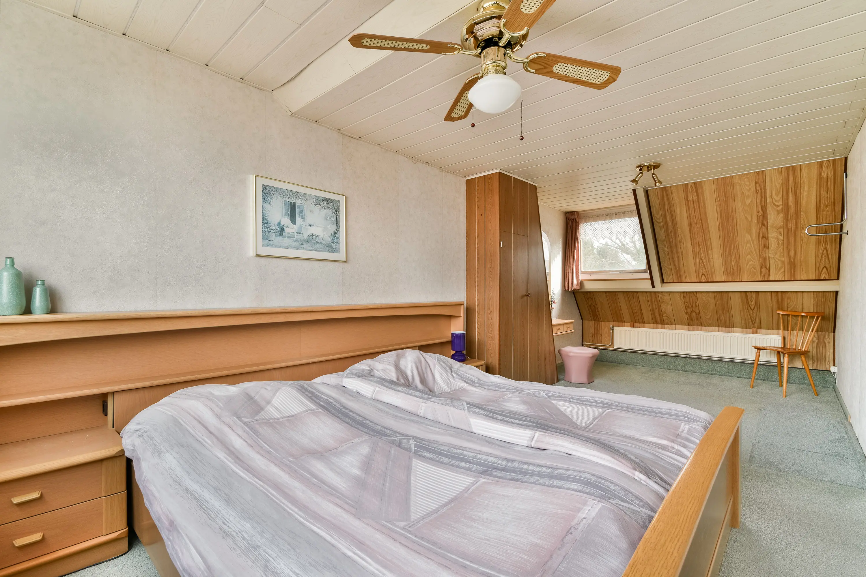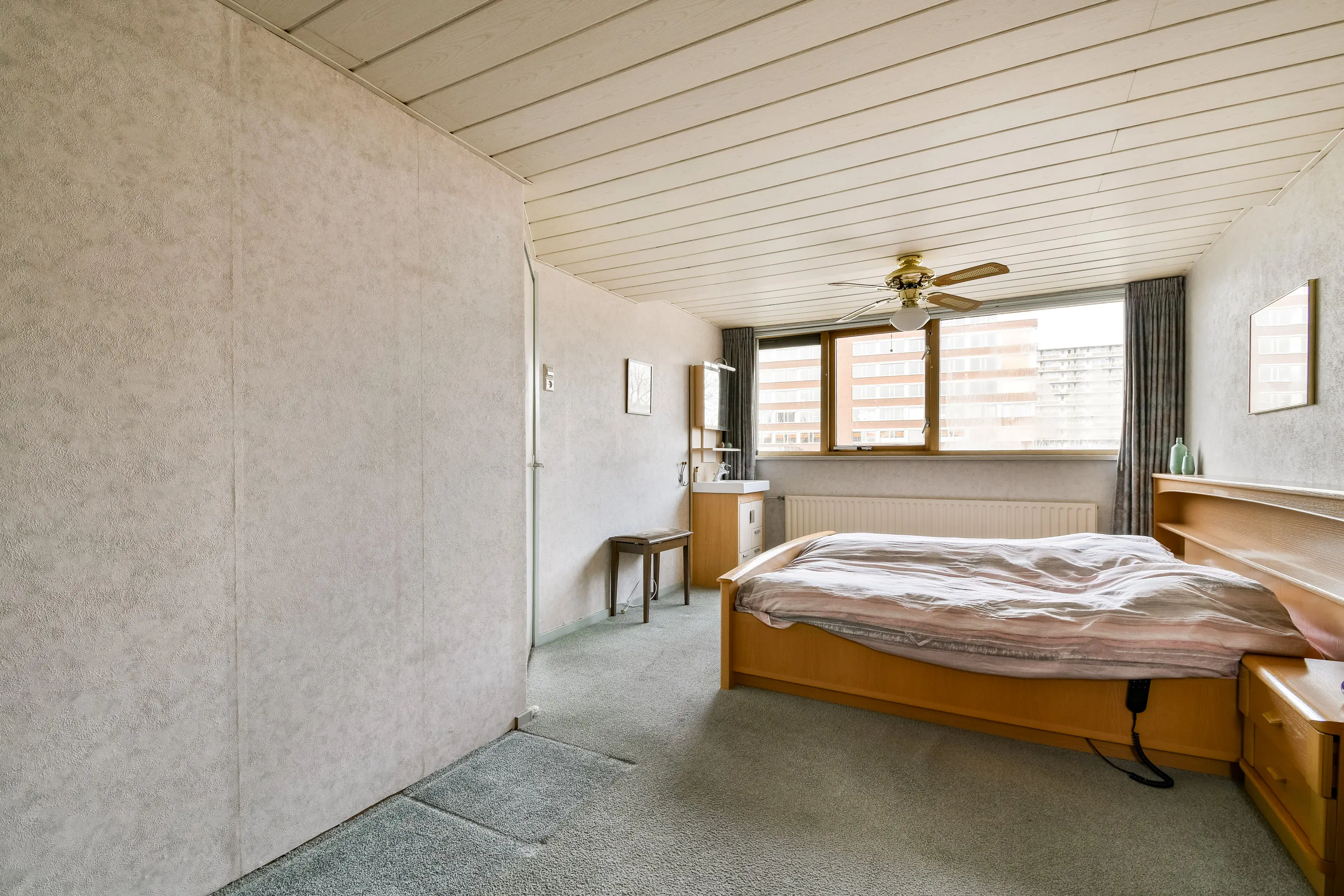 De grootste slaapkamer ligt aan de achterzijde van de woning en is voorzien van vloerbedekking en een waterpunt met zowel warm als koud water. Deze kamer is ontstaan door het samenvoegen van twee slaapkamers en biedt daardoor extra ruimte.