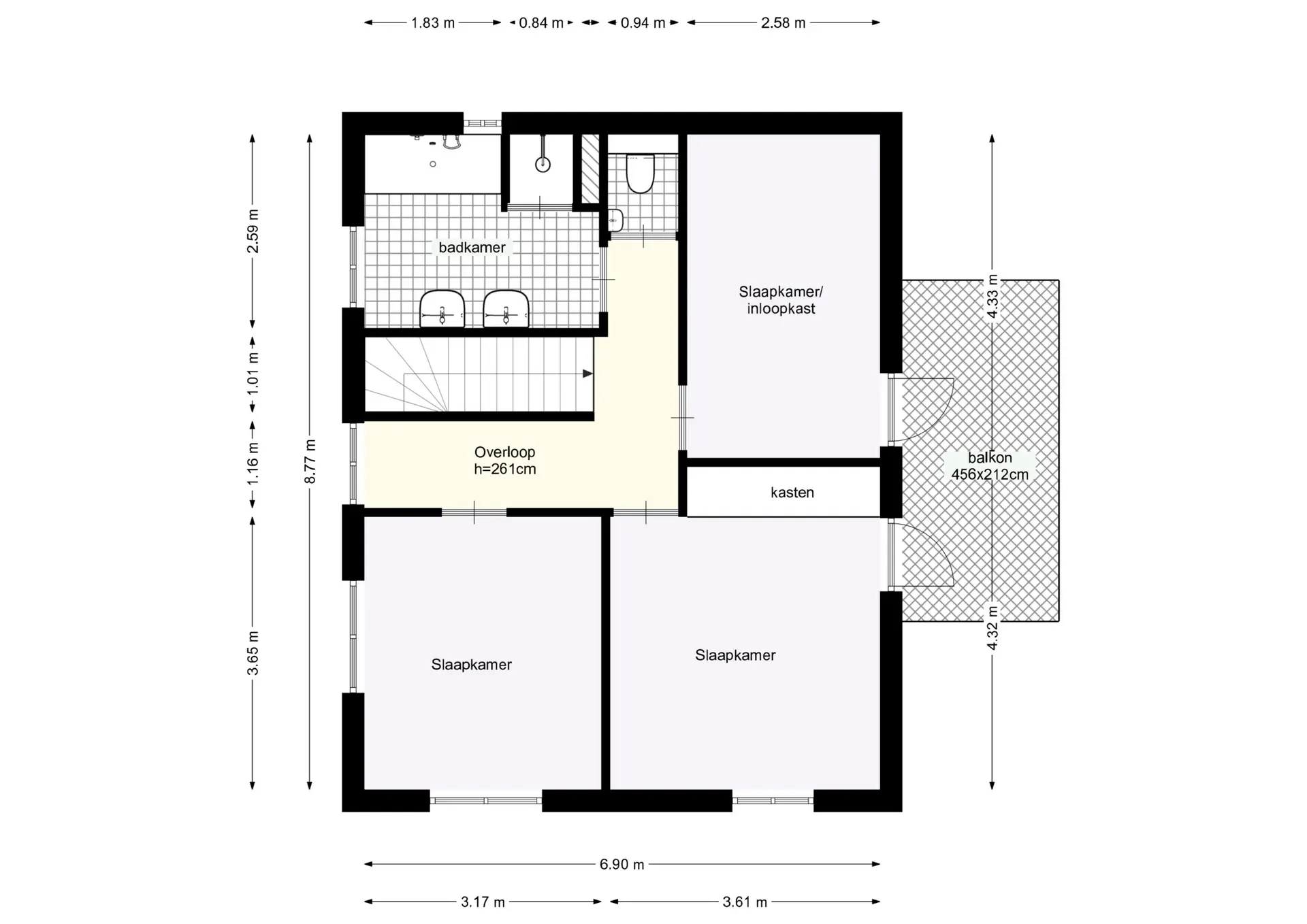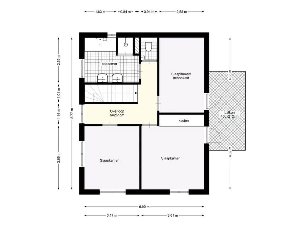De trap leidt naar de eerste verdieping, waar drie ruime slaapkamers op u wachten. De master bedroom is royaal en beschikt over directe toegang tot een eigen balkon de perfecte plek voor een rustige ochtend met een kop koffie. De luxe badkamer is stijlvol afgewerkt en voorzien van een dubbele wastafel, ruime douche en tweede toilet. Naast de slaapkamers vindt u hier ook nog een extra kamer, uitstekend geschikt als inloopkast of thuiskantoor.
