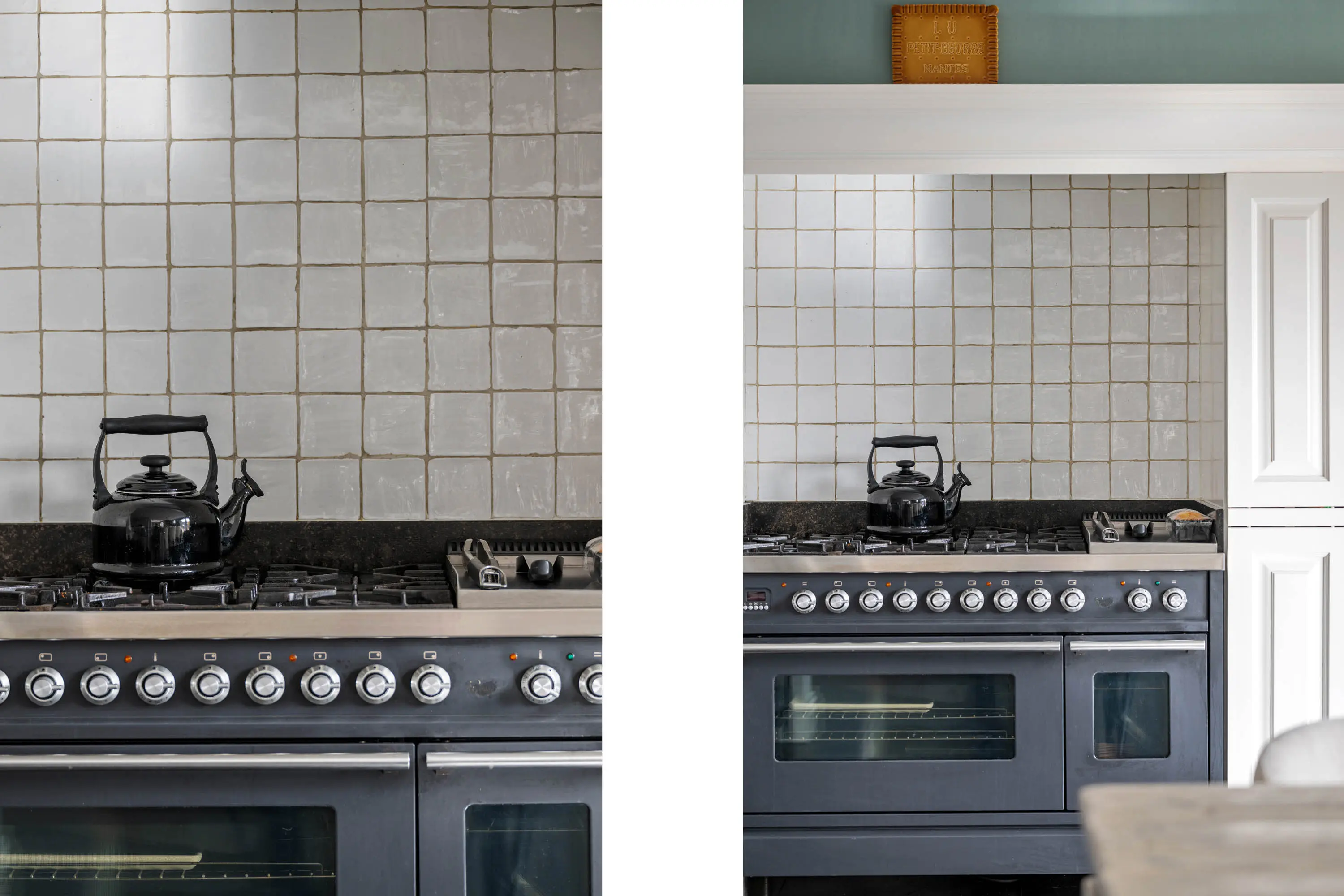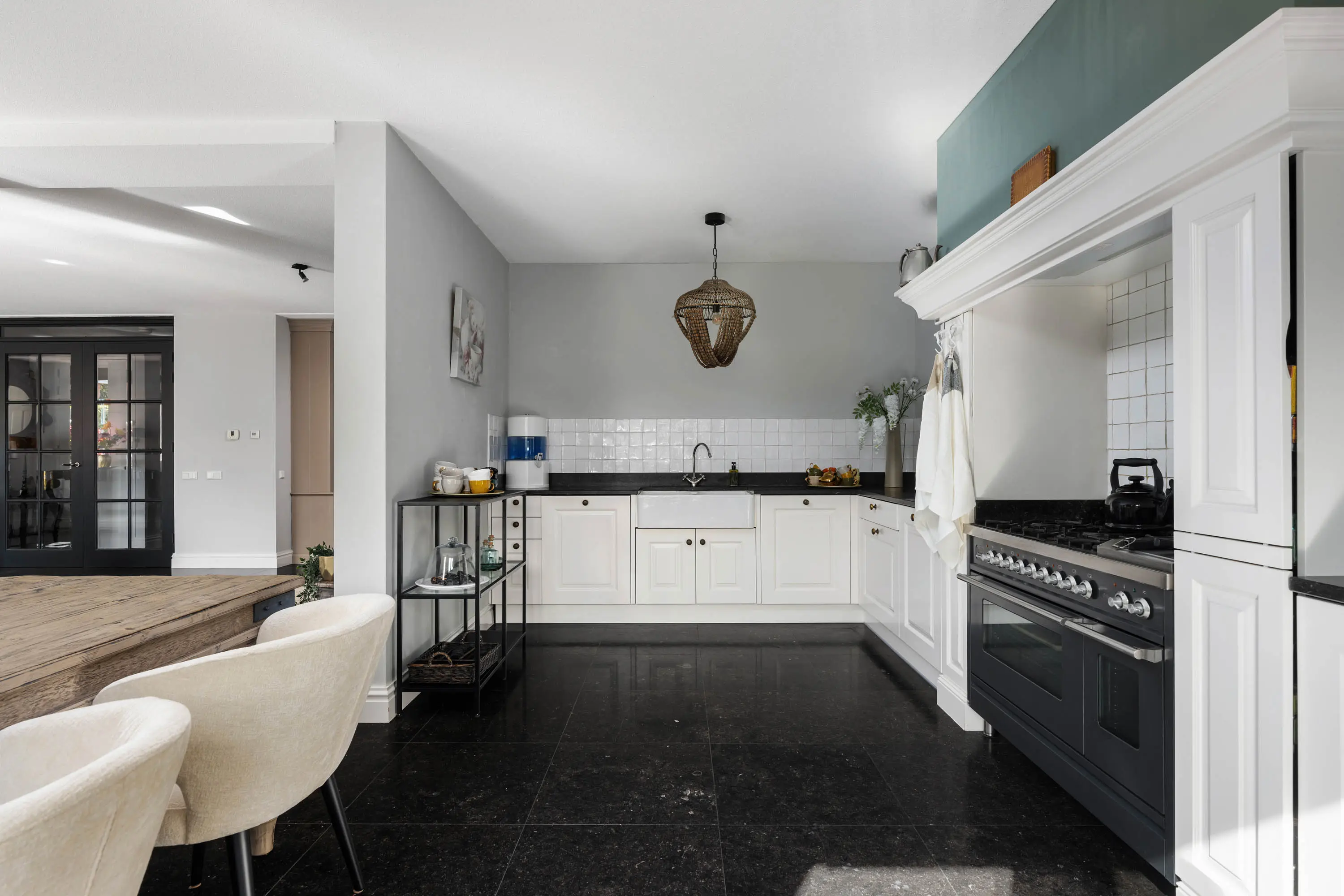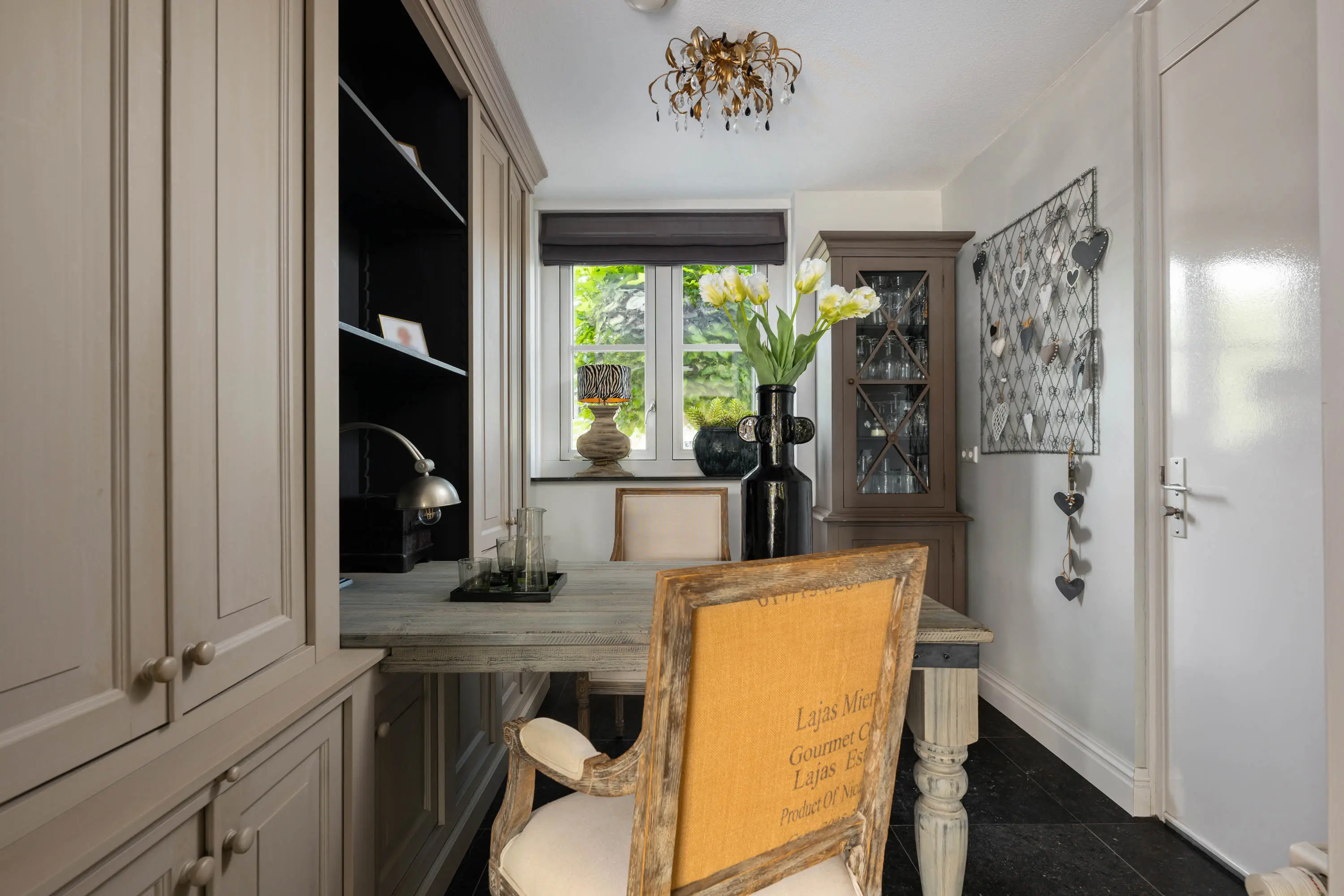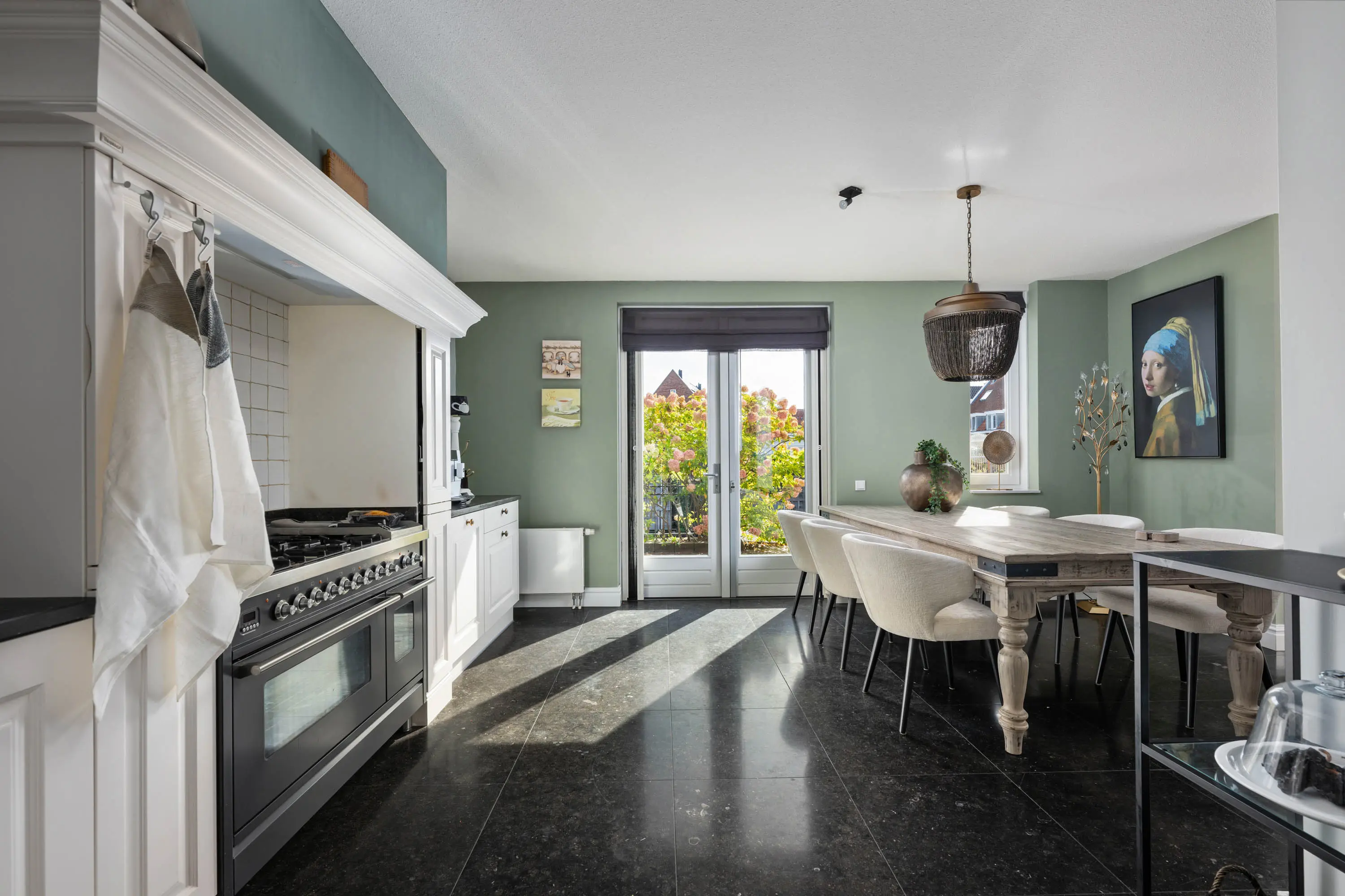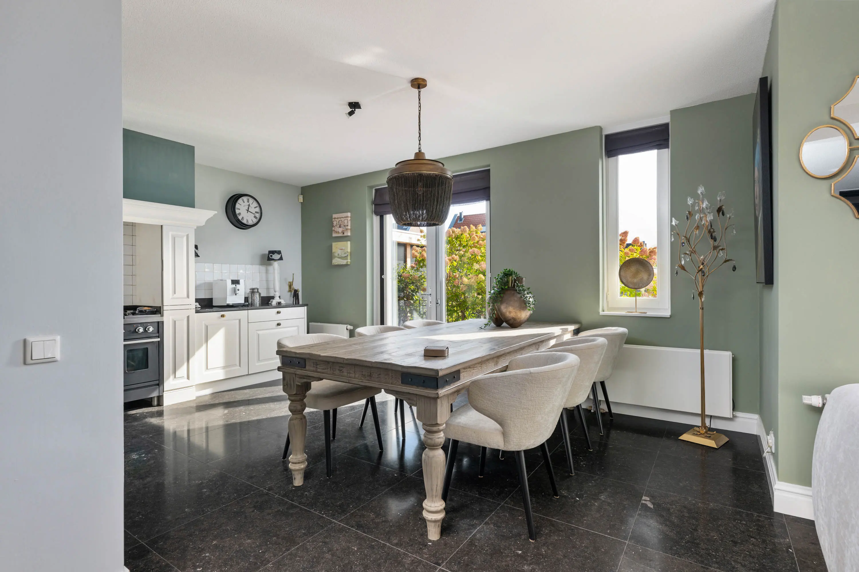 Grenzend aan de woonkamer ligt de eetkamer: een sfeervolle ruimte waar een grote eettafel uitnodigt tot lange diners met familie en vrienden. De moderne keuken vormt het kloppend hart van de woning. Deze is uitgevoerd in een lichte, tijdloze stijl en voorzien van hoogwaardige inbouwapparatuur. Terwijl u kookt, houdt u eenvoudig contact met uw gasten of gezin. De openslaande deuren geven direct toegang tot de zonnige achtertuin, waardoor binnen en buiten moeiteloos in elkaar overlopen.